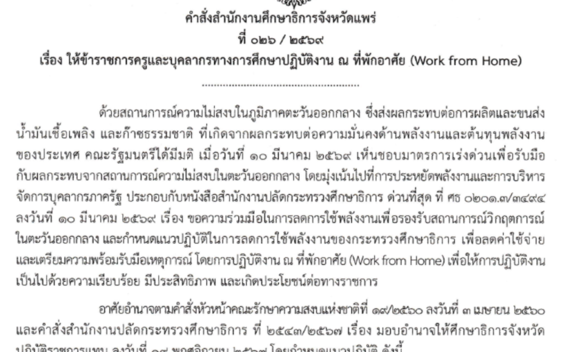 มีนาคม 13, 2569 No comments คำสั่งสำนักงานศึกษาธิการจังหวัดแพร่ ที่ o๒๖/๒๕๖๙ เรื่อง ให้ข้าราชการครูและบุคลากรทางการศึกษาปฏิบัติงาน ณ ที่พักอาศัย (Work from home)