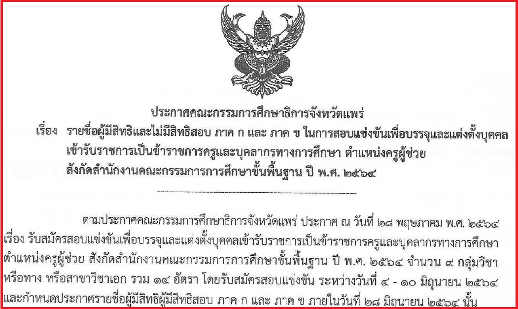 ประกาศ รายชื่อผู้มีสิทธิและไม่มีสิทธิสอบ ภาค ก และ ภาค ข ในการสอบแข่งขันเพื่อบรรจุและแต่งตั้งบุคคล เข้ารับราชการเป็นข้าราชการครูและบุคลากรทางการศึกษา ตำแหน่งครูผู้ช่วย สังกัดสำนักงานคณะกรรมการการศึกษาขั้นพื้นฐาน ปี พ.ศ. 2564