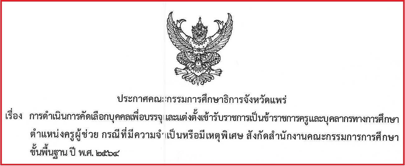พฤศจิกายน 12, 2564 No comments ประกาศ กศจ.แพร่ เรื่องการดำเนินการคัดเลือกบุคคลเพื่อบรรจุและแต่งตั้งเข้ารับราชการเป็นข้าราชการครูและบุคลากรทางการศึกษา ตำแหน่งครูผู้ช่วย กรณีที่มีความจำเป็นหรือมีเหตุพิเศษ สังกัดสำนักงานคณะกรรมการการศึกษา ขั้นพื้นฐาน ปี พ.ศ. ๒๕๖๔ ประกาศ เรื่องการดำเน