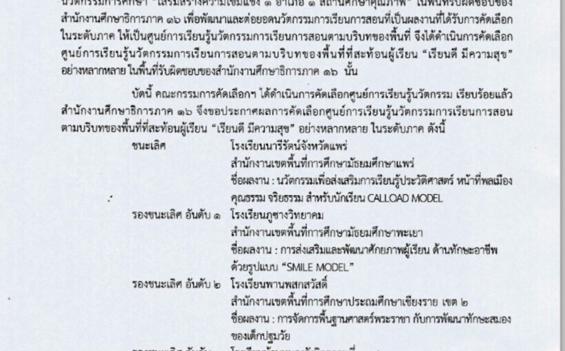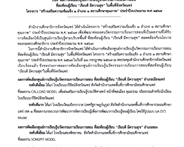 ประกาศสำน้กงานศึกษาธิการจังหวัดแพร่เรื่อง ประกาศผลการคัดเลือก Best Practicesนวัตกรรมการศึกษาเพื่อพัฒนาการศึกษาจังหวัดแพร่โครงการ Innovation For Thai Education (IFTE)นวัตกรรมการศึกษาเพื่อพัฒนาการศึกษาสำนักงานศึกษาธิการจังหวัดแพร่ ประจำปีงบประมาณ พ.ศ. 2567