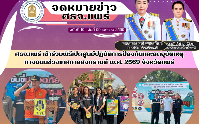 เมษายน 22, 2569 No comments ศธจ.แพร่ เข้าร่วมพิธีเปิดศูนย์ปฏิบัติการป้องกันและลดอุบัติเหตุทางถนนช่วงเทศกาลสงกรานต์ พ.ศ. 2569 จังหวัดแพร่ วันที่ 9 เมษายน 2569