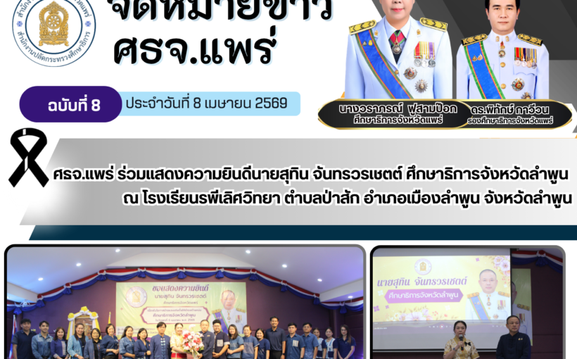 เมษายน 22, 2569 No comments ศธจ.แพร่ ร่วมแสดงความยินดีนายสุทิน จันทรวรเชตต์ ศึกษาธิการจังหวัดลำพูน ณ โรงเรียนรพีเลิศวิทยา ตำบลป่าสัก อำเภอเมืองลำพูน จังหวัดลำพูน วันที่ 8 เมษายน พ.ศ.