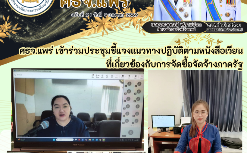 เมษายน 22, 2569 No comments ศธจ.แพร่ เข้าร่วมประชุมชี้แจงแนวทางปฏิบัติตามหนังสือเวียนที่เกี่ยวข้องกับการจัดซื้อจัดจ้างภาครัฐ ศธจ.แพร่ เข้าร่วมประ