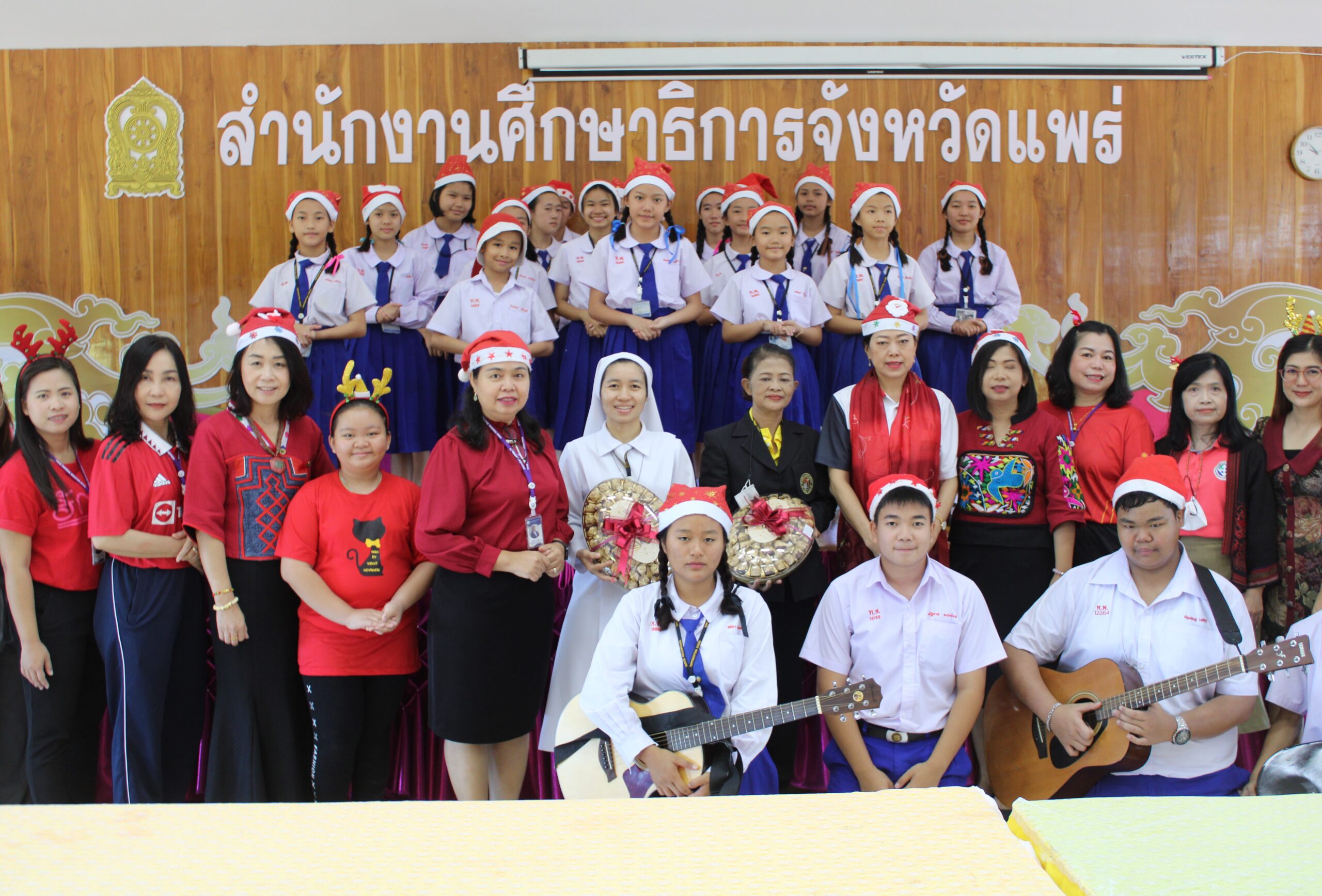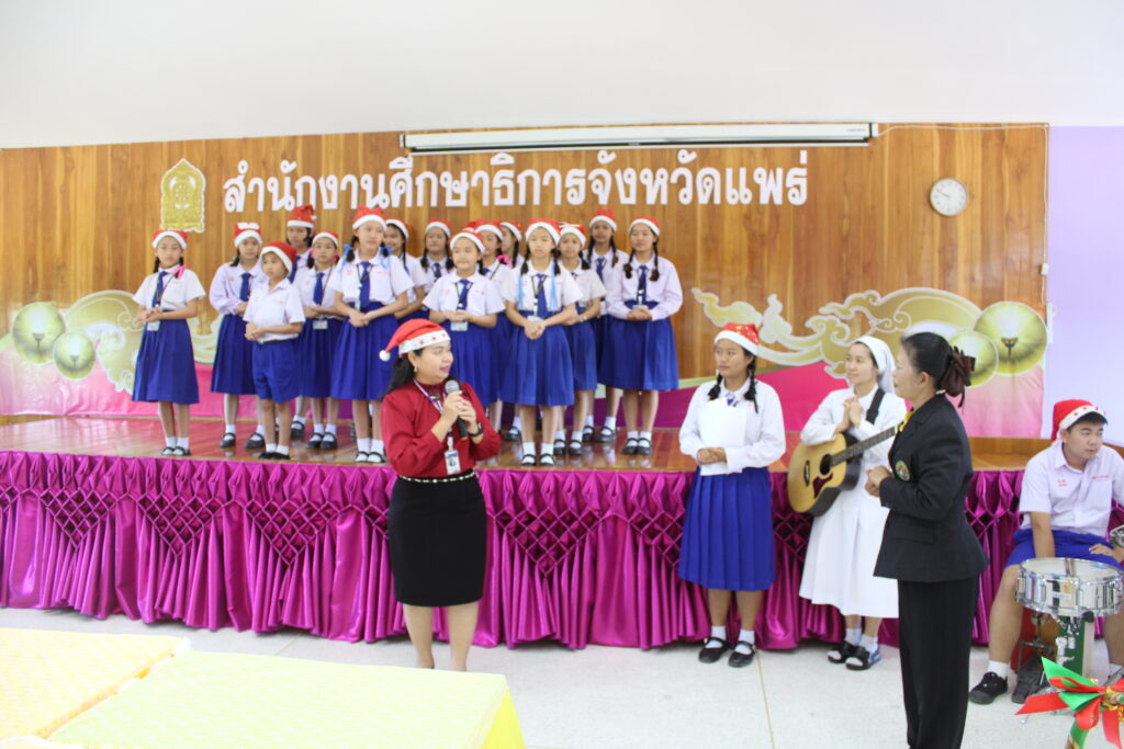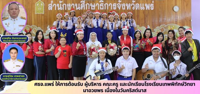วันที่ 20 ธันวาคม 2566 เวลา 09.30 น. นายสุทิน จันทรวรเชตต์ ศึกษาธิการจังหวัดแพร่ มอบหมายให้ คณะผู้บริหาร และบุคลากรสำนักงานศึกษาธิการจังหวัดแพร่ ให้การต้อนรับ ผู้บริหาร คณะครูและนักเรียนโรงเรียนเทพพิทักษ์วิทยา มาอวยพร เนื่องในวันคริสต์มาส ณ ห้องประชุมสำนักงานศึกษาธิการจังหวัดแพร่ ตำบลป่าแมต อำเภอเมืองแพร่ จังหวัดแพร่