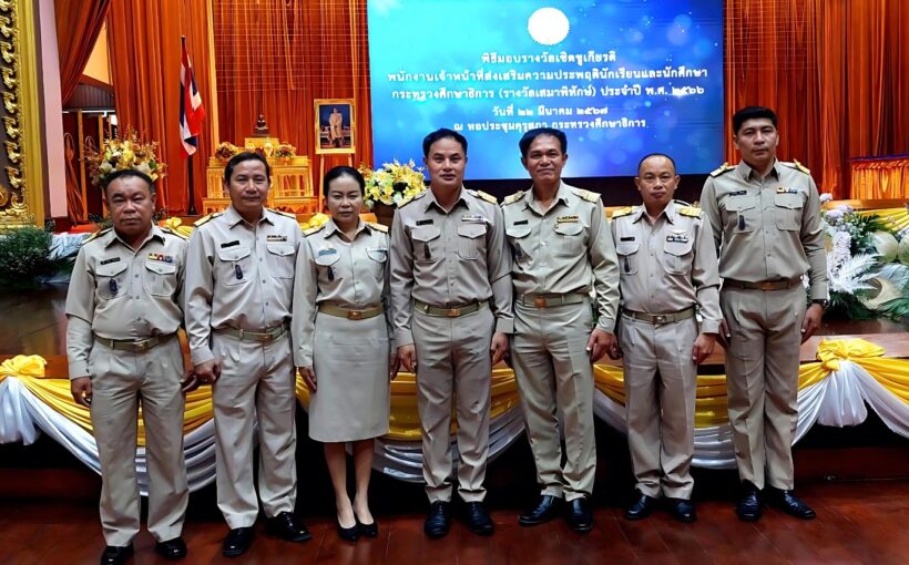 วันที่ 22 มีนาคม 2567 นายสุวิน เทพสาธร รองศึกษาธิการจังหวัดแพร่ นางสาวบุษบา สุกแก้ว ผู้อำนวยการกลุ่มนิเทศ ติดตามและประเมินผล และนายสาโรจน์ ชมสวน เจ้าหน้าที่บริหารทั่วไปปฏิบัติการ เข้ารับรางวัลเชิดชูเกียรติพนักงานเจ้าหน้าที่ส่งเสริมความประพฤตินักเรียนและนักศึกษา กระทรวงศึกษาธิการ (รางวัลเสมาพิทักษ์) ประจำปี พ.ศ. 2566 ณ หอประชุมคุรุสภา กระทรวงศึกษาธิการ กรุงเทพมหานคร