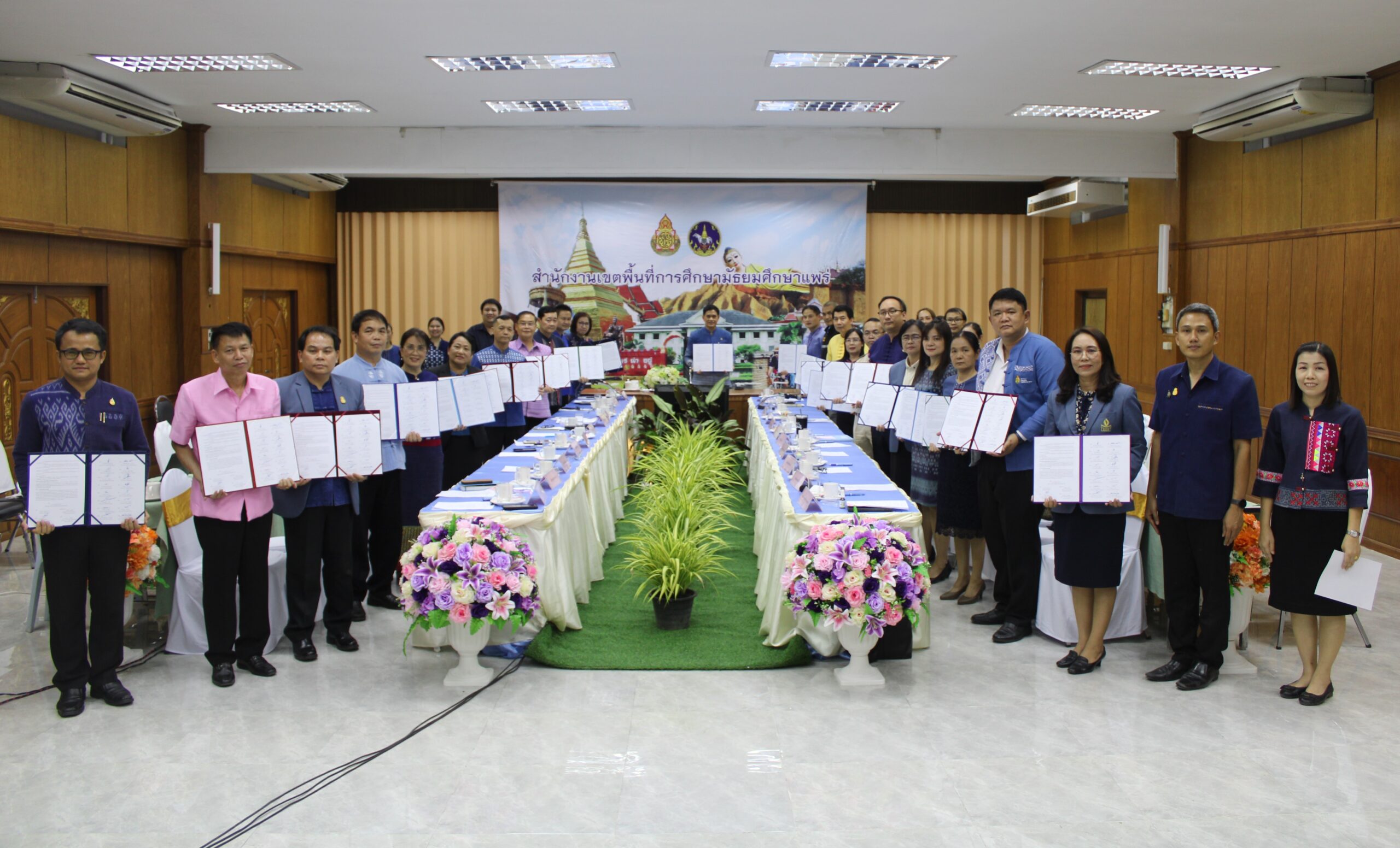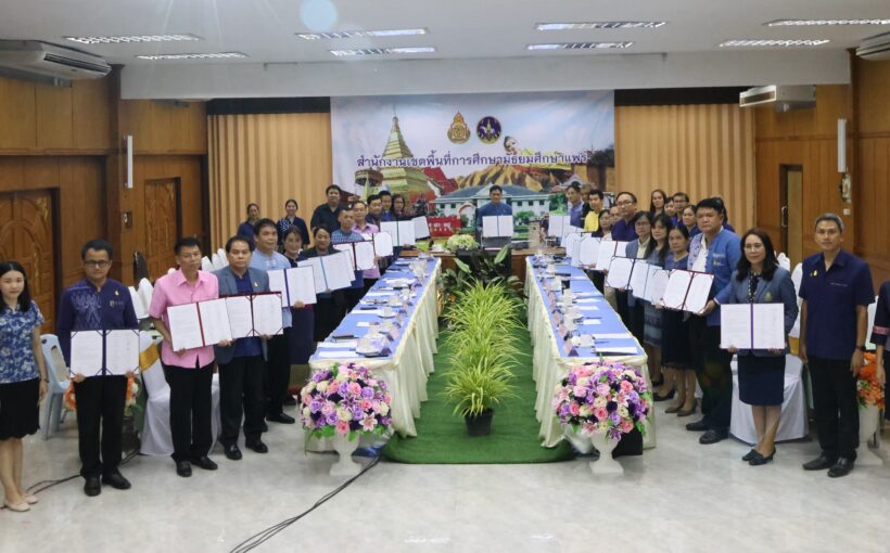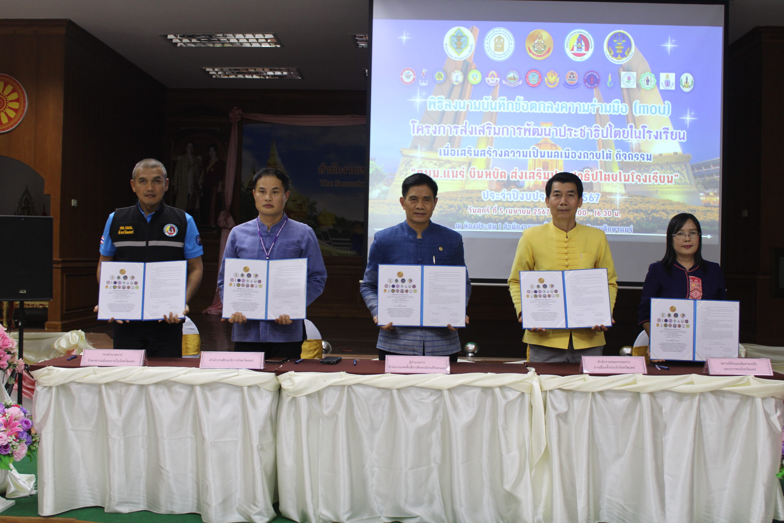 วันที่ 5 เมษายน 2567 เวลา 13.30 น. นายสุทิน จันทรวรเชตต์ ศึกษาธิการจังหวัดแพร่ มอบหมายให้นายสุวิณ เทพสาธร รองศึกษาธิการจังหวัดแพร่ ร่วมพิธีลงนามบันทึกข้อตกลงความร่วมมือ (MOU) เพื่อร่วมขับเคลื่อนโครงการการส่งเสริมการพัฒนาประชาธิปไตยในโรงเรียน เสริมสร้างความเป็นพลเมือง ประจำปีงบประมาณ 2567 เพื่อพัฒนาการจัดการเรียนรู้ประวัติศาสตร์ หน้าที่พลเมือง ศีลธรรม และประชาธิปไตยในสังคมร่วมสมัย และส่งเสริมกิจกรรมสภานักเรียน ชุมนุม ชมรม และการมีส่วนร่วมให้เกิดวิถีประชาธิปไตยในโรงเรียน เป็นพลเมืองที่ดี และแสดงออกอย่างสร้างสรรค์ โดยมีนายประสิทธิ์ อินวรรณา ผู้อำนวยการสำนักงานเขตพื้นที่การศึกษามัธยมศึกษาแพร่ เป็นประธานในพิธี ณ ห้องประชุม 1 สำนักงานเขตพื้นที่การศึกษามัธยมศึกษาแพร่ ตำบลในเวียง อำเภอเมืองแพร่ จังหวัดแพร่