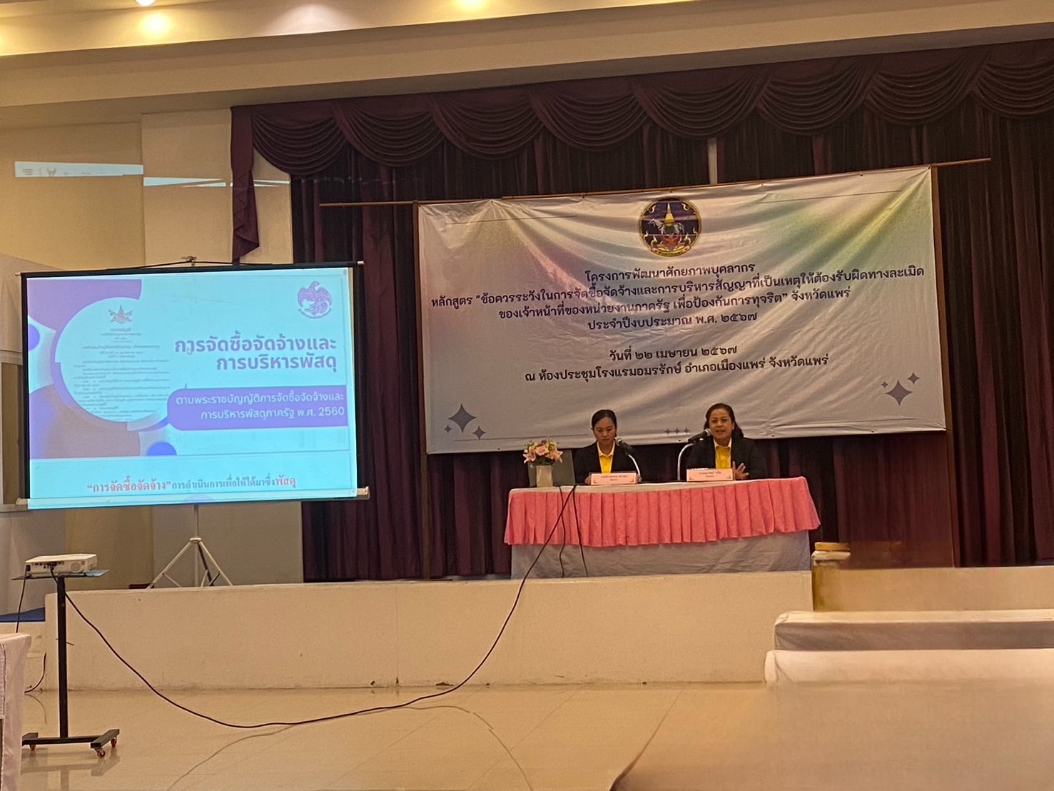 วันที่ 22 เมษายน 2567 นายสุทิน จันทรวรเชตต์ ศึกษาธิการจังหวัดแพร่ มอบหมายให้นางสาวกานดา รัศมี นักวิชาการเงินและบัญชีปฏิบัติการ และนางสาวลักษิกา เขียนงาม เจ้าหน้าที่พัสดุ เข้าร่วมฝึกอบรมโครงการพัฒนาศักยภาพบุคลากร หลักสูตร “ข้อควรระวังในการจัดซื้อจัดจ้าง และการบริหารสัญญาที่เป็นเหตุให้ต้องรับผิดทางละเมิดของเจ้าหน้าที่ของหน่วยงานภาครัฐเพื่อป้องกันการทุจริต” จังหวัดแพร่ ประจำปีงบประมาณ พ.ศ. 2567 เพื่อเสริมสร้างความรู้ความเข้าใจเกี่ยวกับหลักและวิธีการปฏิบัติตามกฎหมายและระเบียบการจัดซื้อจัดจ้าง ความรู้เกี่ยวกับความรับผิดทางละเมิด สร้างความตระหนักรู้ให้แก่เจ้าหน้าที่หน่วยงานภาครัฐ และเป็นมาตรการสำคัญในการป้องกันการทุจริตที่เกี่ยวข้อง โดยมีกลุ่มเป้าหมายประกอบด้วย ข้าราชการ/บุคลากรผู้ปฏิบัติงานด้านการเงินและบัญชี และผู้ปฏิบัติงานด้านพัสดุของหน่วยงานราชการทั้งระดับส่วนกลางและส่วนภูมิภาค ณ โรงแรมอมรรักษ์ ตำบลในเวียง อำเภอเมืองแพร่ จังหวัดแพร่