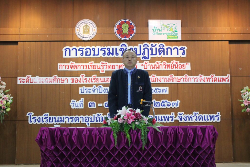 วันที่ 3 สิงหาคม 2567 เวลา 08.30 น. นายสุทิน จันทรวรเชตต์ ศึกษาธิการจังหวัดแพร่ เป็นประธานกล่าวเปิดการอบรมเชิงปฏิบัติการโครงการส่งเสริมการจัดการเรียนรู้วิทยาศาสตร์ “บ้านนักวิทย์น้อย” ระดับประถมศึกษาของโรงเรียนเอกชนในกำกับสำนักงานศึกษาธิการจังหวัดแพร่ ปีงบประมาณ พ.ศ.2567 ระหว่างวันที่ 3 – 4 สิงหาคม 2567 ณ โรงเรียนมารดาอุปถัมภ์ อำเภอเมืองแพร่ จังหวัดแพร่