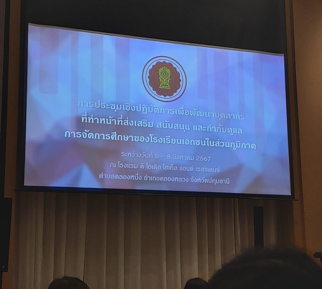 สุนันต๊ะ นักวิชาการศึกษาชำนาญการ เข้าร่วมประชุมเชิงปฏิบัติการเพื่อพัฒนาบุคลากรที่ทำหน้าที่ส่งเสริม สนับสนุน และกำกับดูแล การจัดการศึกษาของโรงเรียนเอกชนในส่วนภูมิภาค ระหว่างวันที่ 5 – 8 สิงหาคม 2567 ณ โรงแรมดิ ไอเดิลโฮเท็ล แอนด์ เรสสิเดนซ์ ตำบลคลองหนึ่ง อำเภอคลองหลาง จังหวัดปทุมธานี