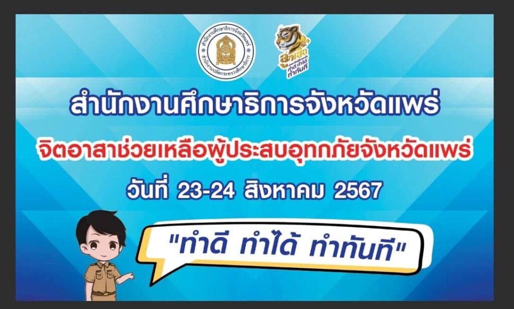 วันที่ 24 สิงหาคม 2567 เวลา 11.00 น. นายสุทิน จันทรวรเชตต์ ศึกษาธิการจังหวัดแพร่และหัวหน้าศูนย์เสมารักษ์ฯ พร้อมด้วยบุคลากรสำนักงานศึกษาธิการจังหวัดแพร่ ร่วมบริจาคอาหารและสิ่งของช่วยเหลือผู้ประสบอุทกภัยในพื้นที่จังหวัดแพร่ ณ ลานวัฒนธรรม องค์การบริหารส่วนจังหวัดแพร่ อำเภอเมืองแพร่ จังหวัดแพร่