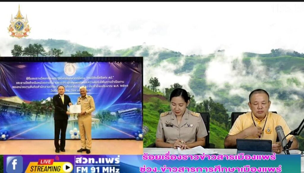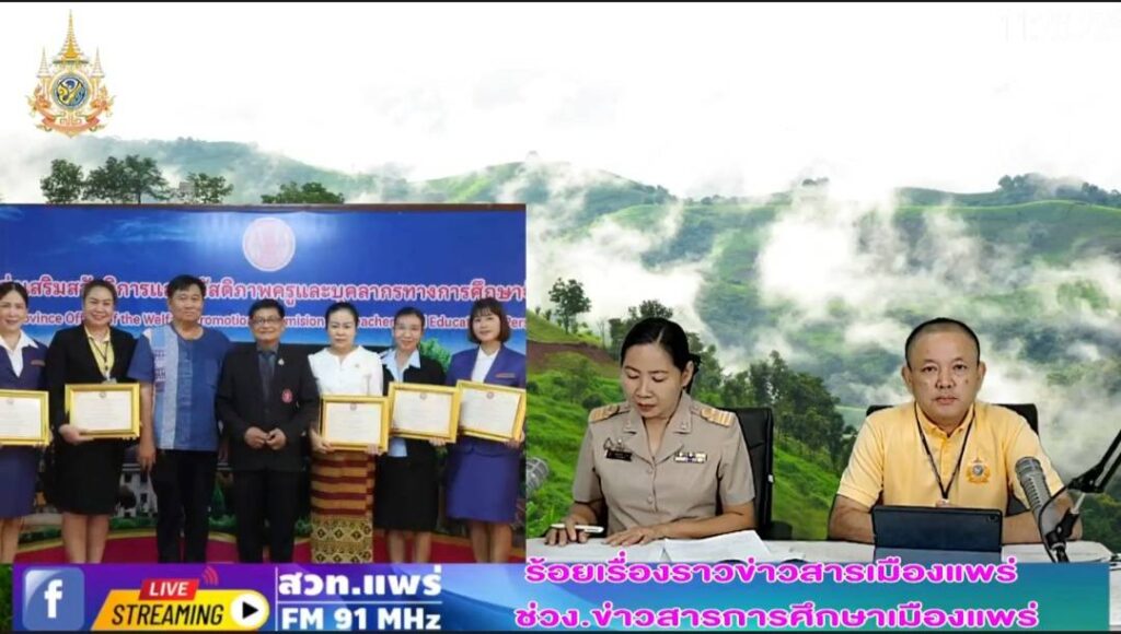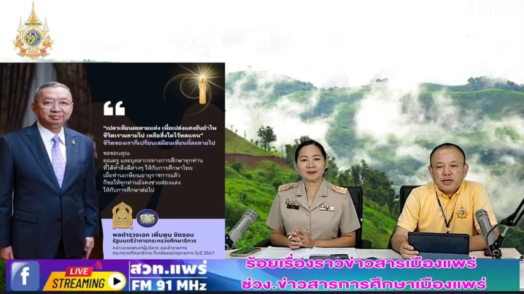 รายการร้อยเรื่องราวข่าวสารเมืองแพร่ ช่วงข่าวสารการศึกษาเมืองแพร่ ออกอากาศวันที่ 1 ตุลาคม 2567 โดยนายสุทิน จันทรวรเชตต์ ศึกษาธิการจังหวัดแพร่ และนางกนกวรรณ มะลิ นักวิชาการศึกษา ชำนาญการ (เกษียณอายุราชการ,ศธจ.แพร่รับรางวัล OIT ระดับ AA,รางวัลคนดีศรี สกสค.,ธนาคารหน่วยกิต,รางวัลสมเด็จเจ้าฟ้ามหาจักรี,ประชุมคณะอนุกรรมการปฐมวัยจังหวัดแพร่,ประชุมคณะอนุกรรมการคุ้มครองเด็ก)