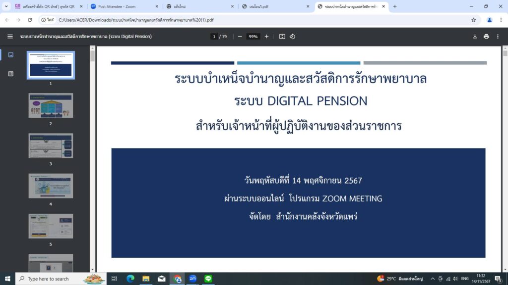 วันที่ 14 พฤศจิกายน 2567 นายสุทิน จันทรวรเชตต์ ศึกษาธิการจังหวัดแพร่ มอบหมายให้นางสาวกานดา รัศมี นักวิชาการเงินและบัญชีปฏิบัติการ เข้าร่วมประชุมซักซ้อมความเข้าใจหลักเกณฑ์และวิธีปฏิบัติงานในระบบบำเหน็จบำนาญและสวัสดิการรักษาพยาบาล (ระบบ Digital Pension) สำหรับผู้ปฏิบัติงานของส่วนราชการ เพื่อให้เจ้าหน้าที่ผู้ปฏิบัติงานของส่วนราชการ มีความรู้ความเข้าใจเกี่ยวกับหลักเกณฑ์และวิธีปฏิบัติในการขอรับและการจ่ายเบี้ยหวัด บำเหน็จบำนาญ และเงินอื่นในลักษณะเดียวกันในระบบบำเหน็จบำนาญและสวัสดิการรักษาพยาบาล ผ่านระบบ Zoom Meeting