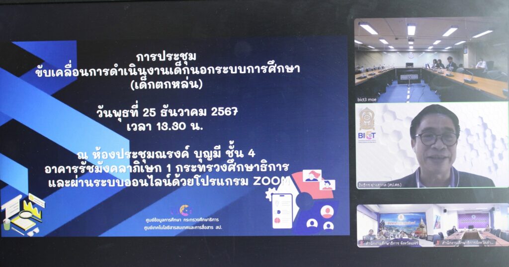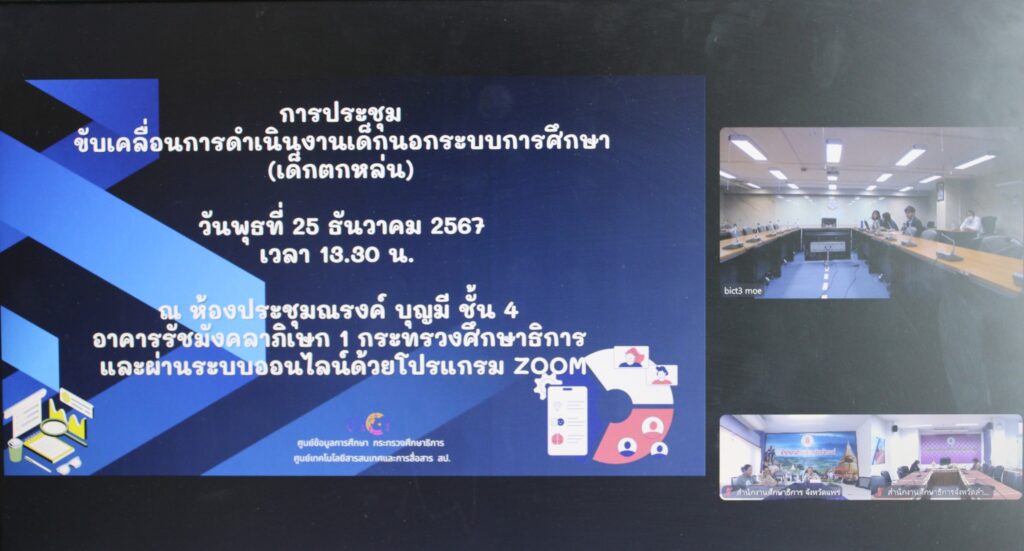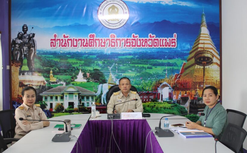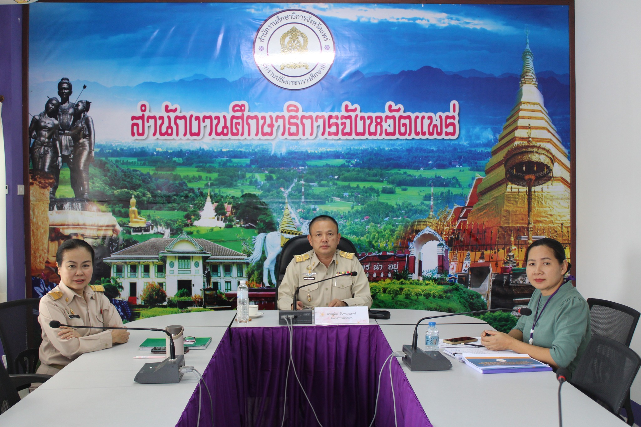 วันที่ 25 ธันวาคม 2567 เวลา 13.30 น. นายสุทิน จันทรวรเชตต์ ศึกษาธิการจังหวัดแพร่ พร้อมด้วยนางสาวบุษบา สุกแก้ว ผู้อำนวยการกลุ่มนิเทศ ติดตาม และประเมินผล และนางกนกวรรณ มะลิ นักวิชาการศึกษาชำนาญการ ปฏิบัติหน้าที่ผู้อำนวยการกลุ่มพัฒนาการศึกษา เข้าร่วมประชุมขับเคลื่อนการดำเนินการติดตามเด็กนอกระบบการศึกษา โดยมีนายอิทธิกร ช่างสากล ผู้อำนวยการศูนย์เทคโนโลยีสารสนเทศและการสื่อสาร สำนักงานปลัดกระทรวงศึกษาธิการ เป็นประธานการประชุมฯ ผ่านระบบ Zoom Meeting ณ ห้องประชุมเกี้ยวฝั้น สำนักงานศึกษาธิการจังหวัดแพร่ ตำบลป่าแมต อำเภอเมืองแพร่ จังหวัดแพร่