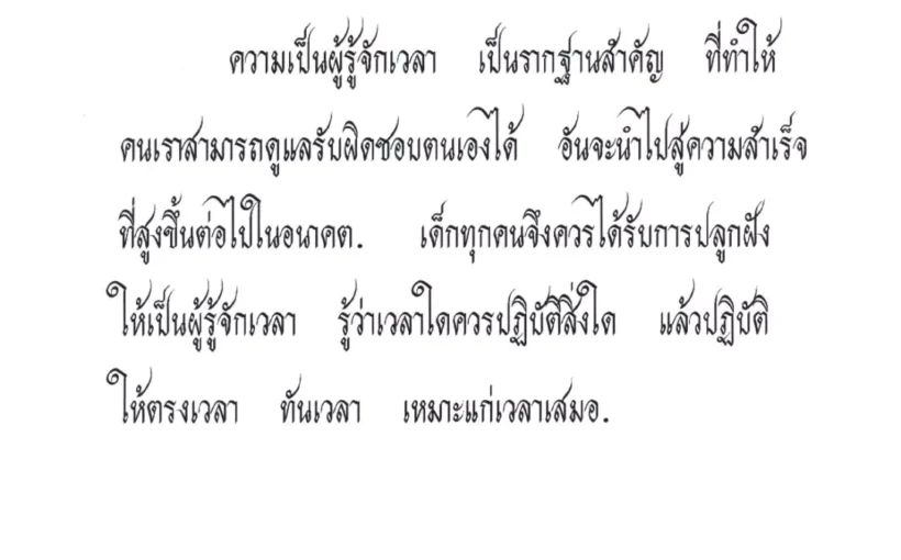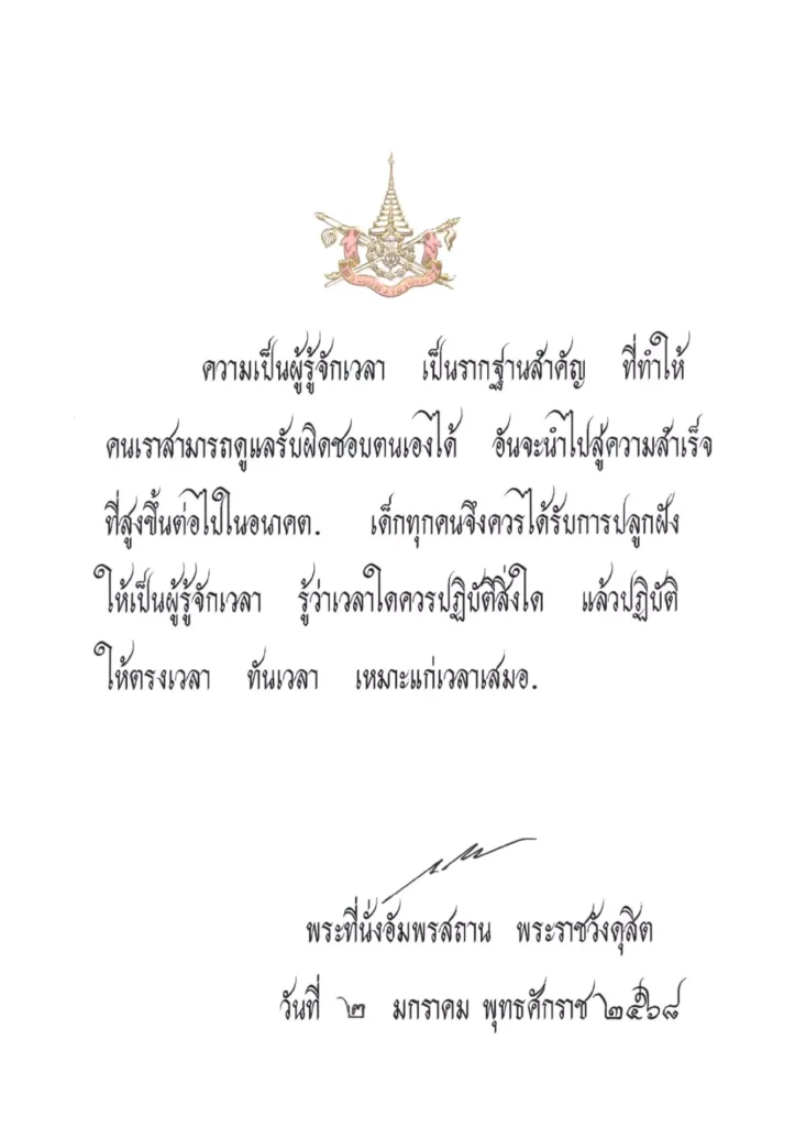 “ความเป็นผู้รู้จักเวลา เป็นรากฐานสำคัญ ที่ทำให้คนเราสามารถดูแลรับผิดชอบตนเองได้ อันจะนำไปสู่ความสำเร็จที่สูงขึ้นต่อไปในอนาคต. เด็กทุกคนจึงควรได้รับการปลูกฝังให้เป็นผู้รู้จักเวลา รู้ว่าเวลาใดควรปฏิบัติสิ่งใด แล้วปฏิบัติให้ตรงเวลา ทันเวลา เหมาะแก่เวลาเสมอ.”