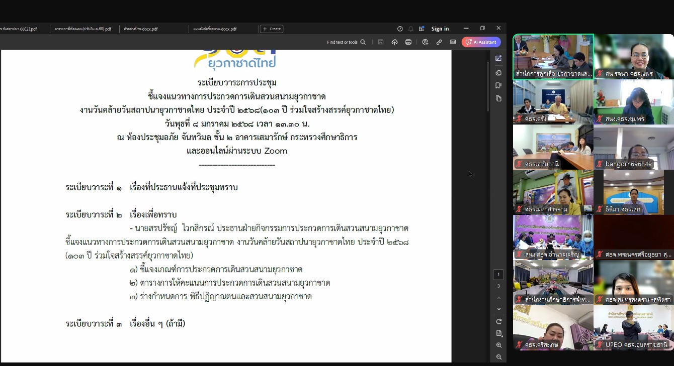 วันที่ 8 มกราคม 2568 เวลา 13.30 น. นายสุทิน จันทรวรเชตต์ ศึกษาธิการจังหวัดแพร่ มอบหมายให้นางรจนา กาแก้ว ผู้อำนวยการกลุ่มลูกเสือ ยุวกาชาดและกิจการนักเรียน พร้อมด้วยบุคลากรกลุ่มลูกเสือ ยุวกาชาดและกิจการนักเรียน เข้าร่วมประชุมชี้แจงแนวทางการประกวดการเดินสวนสนามยุวกาชาด งานวันคล้ายวันสถาปนายุวกาชาดไทย ประจำปี 2568 (103 ปี ร่วมใจสร้างสรรค์ยุวกาชาดไทย) โดยมี ดร.อำนาจ สายฉลาด ผู้อำนวยการสำนักการลูกเสือ ยุวกาชาดและกิจการนักเรียน เป็นประธานการประชุมฯ ผ่านระบบ Zoom Meeting