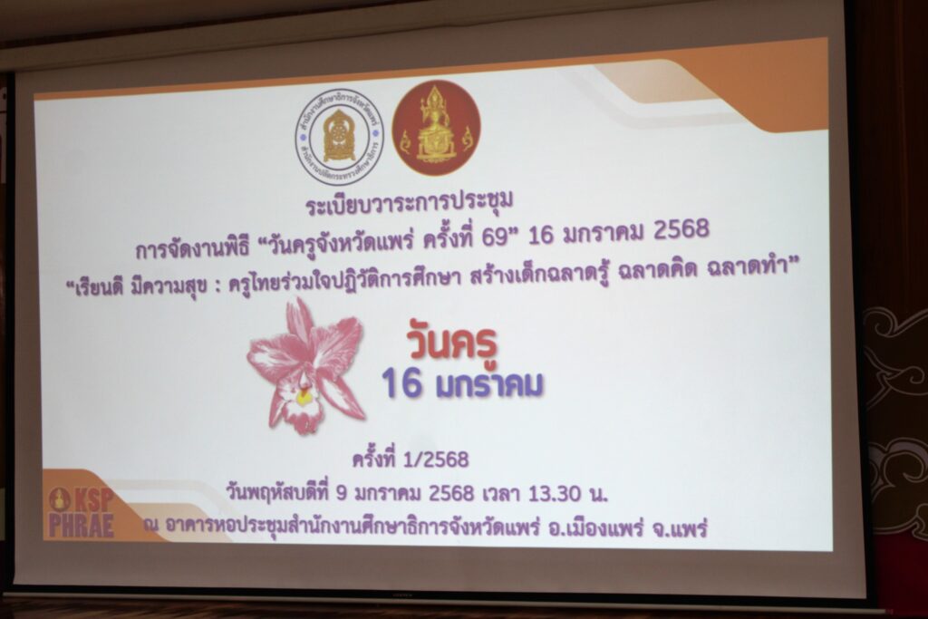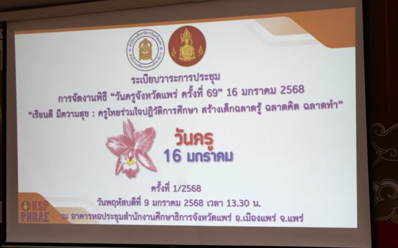 วันที่ 9 มกราคม 2568 เวลา 13.30 น. นายสุทิน จันทรวรเชตต์ ศึกษาธิการจังหวัดแพร่ เป็นประธานการประชุมซักซ้อมและเตรียมความพร้อมการจัดงานพิธี “วันครูจังหวัดแพร่ ครั้งที่ 69” 16 มกราคม 2568 “เรียนดี มีความสุข : ครูไทยร่วมใจปฏิวัติการศึกษา สร้างเด็กฉลาดรู้ ฉลาดคิด ฉลาดทำ” ครั้งที่ 2/2568 โดยมีบุคลากรหน่วยงานทางการศึกษา สถานศึกษา เข้าร่วมประชุมฯ ณ หอประชุมสำนักงานศึกษาธิการจังหวัดแพร่ ตำบลป่าแมต อำเภอเมืองแพร่ จังหวัดแพร่