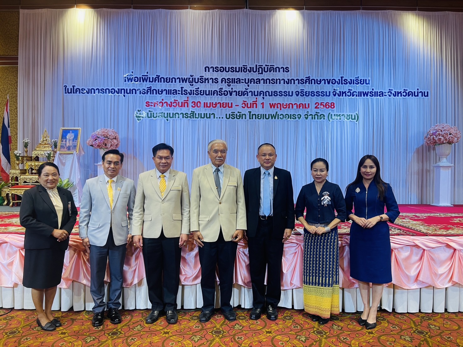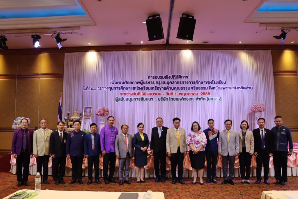 วันที่ 30 เมษายน 2568 นายสุทิน จันทรวรเชตต์ ศึกษาธิการจังหวัดแพร่ พร้อมด้วยนายสาคร ดวงใน นางจิราพร วงศ์ชัยพาณิชย์ อาสาสมัครประจำพื้นที่จังหวัดแพร่ นางสาวบุษบา สุกแก้ว ผู้อำนวยการกลุ่มนิเทศ ติดตาม และประเมินผล และนางลภัสกร ถิรชานิธิศ ศึกษานิเทศก์ชำนาญการ สำนักงานศึกษาธิการจังหวัดแพร่ เข้าร่วมอบรมเชิงปฏิบัติการเพื่อเพิ่มศักยภาพผู้บริหาร ครูและบุคลากรทางการศึกษาของโรงเรียนในโครงการกองทุนการศึกษาและโรงเรียนเครือข่ายด้านคุณธรรม จริยธรรม จังหวัดแพร่ และจังหวัดน่าน ระหว่างวันที่ 30 เมษายน – 1 พฤษภาคม 2568 โดยมีนายอัมพร พินะสา ประธานอาสาสมัครโรงเรียนในโครงการกองทุนการศึกษา เป็นประธานกล่าวเปิดการอบรมฯ ณ โรงแรมเทวราช อำเภอเมืองน่าน จังหวัดน่าน