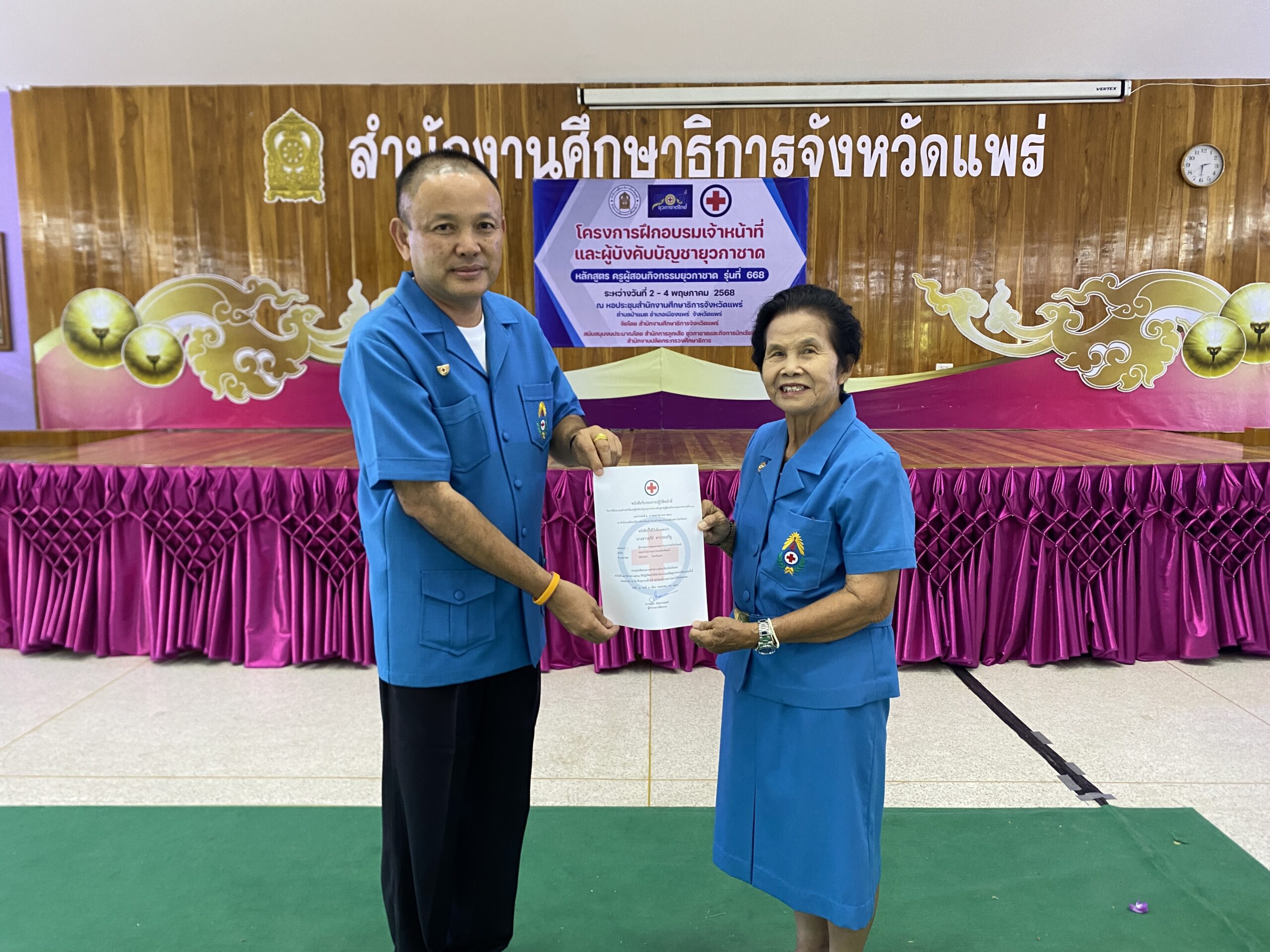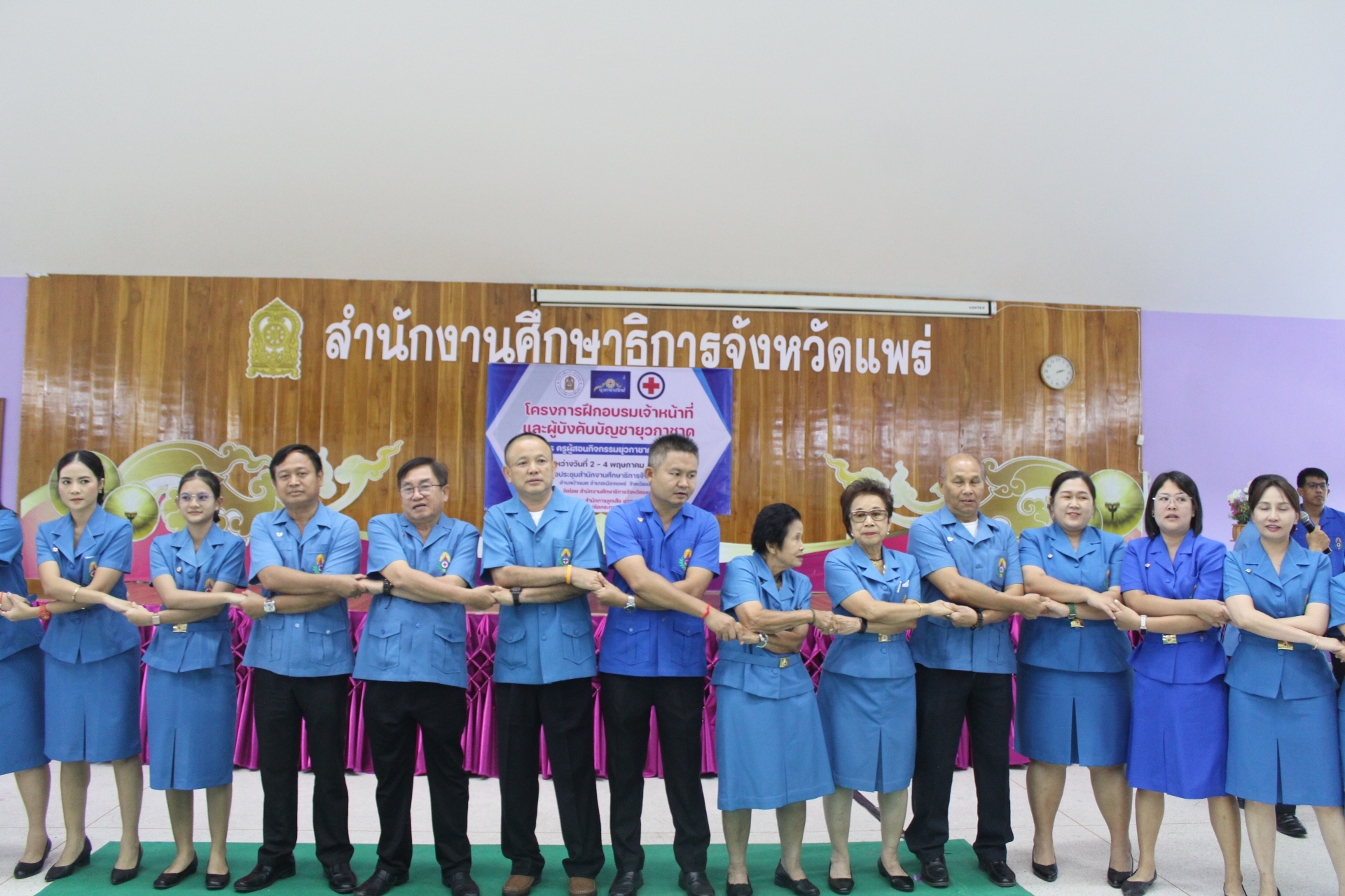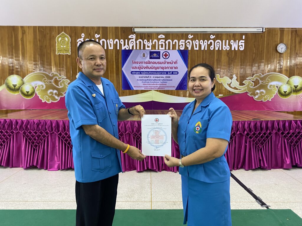 วันที่ 4 พฤษภาคม 2568 นายสุทิน จันทรวรเชตต์ ศึกษาธิการจังหวัดแพร่ ผู้อำนวยการฝึก เป็นประธานในพิธีปิดการอบรมโครงการฝึกอบรมเจ้าหน้าที่และผู้บังคับบัญชายุวกาชาด หลักสูตรครูผู้สอนกิจกรรมยุวกาชาด รุ่นที่ 668 สำนักงานศึกษาธิการจังหวัดแพร่ ระหว่างวันที่ 2 – 4 พฤษภาคม 2568 ณ หอประชุมสำนักงานศึกษาธิการจังหวัดแพร่ ตำบลป่าแมต อำเภอเมืองแพร่ จังหวัดแพร่