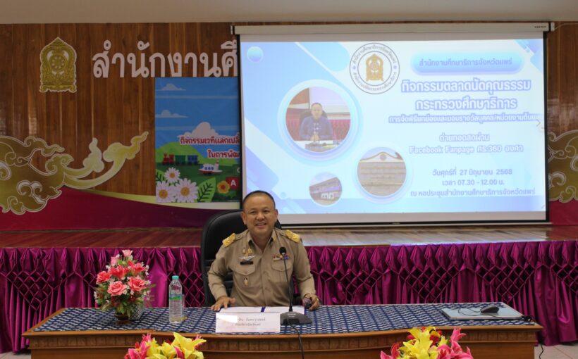 วันที่ 27 มิถุนายน 2568 เวลา 08.30 น. นายสุเทพ แก่งสันเทียะ ปลัดกระทรวงศึกษาธิการ เป็นประธานกล่าวเปิดกิจกรรมตลาดนัดคุณธรรมกระทรวงศึกษาธิการ ภายใต้โครงการขับเคลื่อนการส่งเสริมและพัฒนาคุณธรรมจริยธรรม กระทรวงศึกษาธิการ ประจำปีงบประมาณ พ.ศ. 2568 แผนงานบูรณาการต่อต้านการทุจริตและประพฤติมิชอบ เพื่อให้ส่วนราชการ หน่วยงานในสังกัดและในกำกับของกระทรวงศึกษาธิการ เข้าร่วมส่งเสริมสภาพแวดล้อมที่เอื้อต่อการส่งเสริมคุณธรรม การทำความดีที่เหมาะสมกับภารกิจและบริบทของหน่วยงาน รวมทั้งพัฒนาบุคลากรให้มีความรู้ความเข้าใจระบบและการเสริมสร้างขีดความสามารถของกลไกในการขับเคลื่อนและส่งเสริมคุณธรรมในองค์กร ทั้งนี้ นายสุทิน จันทรวรเชตต์ ศึกษาธิการจังหวัดแพร่ พร้อมด้วยบุคลากรสำนักงานศึกษาธิการจังหวัดแพร่ เข้าร่วมกิจกรรมตลาดนัดคุณธรรมกระทรวงศึกษาธิการฯ ผ่านระบบ Zoom Meeting ณ สำนักงานศึกษาธิการจังหวัดแพร่ ตำบลป่าแมต อำเภอเมืองแพร่ จังหวัดแพร่