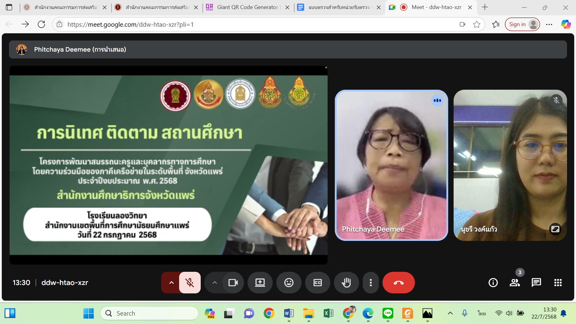 วันที่ 22 กรกฎาคม 2568 นายสุทิน จันทรวรเชตต์ ศึกษาธิการจังหวัดแพร่ มอบหมายให้นางสาวบุษบา สุกแก้ว ผู้อำนวยการกลุ่มนิเทศ ติดตาม และประเมินผล สำนักงานศึกษาธิการจังหวัดแพร่ พร้อมด้วยนางสาวพิชญา ดีมี และนางสาวนุชรี วงค์แก้ว ศึกษานิเทศก์สำนักงานศึกษาธิการจังหวัดแพร่ นิเทศ ติดตาม ผลการดำเนินงานสถานศึกษาภายใต้โครงการพัฒนาสมรรถนะครูและบุคลากรทางการศึกษา ตามมาตรฐานวิชาชีพและให้มีทักษะในการจัดการเรียนรู้ในศตวรรษที่ 21 โดยความร่วมมือของภาคเครือข่ายในระดับพื้นที่จังหวัดแพร่ ในรูปแบบทางไกลผ่านระบบ Google Meeting โรงเรียนลองวิทยา อำเภอลอง จังหวัดแพร่ สำนักงานเขตพื้นที่การศึกษามัธยมศึกษาแพร่
