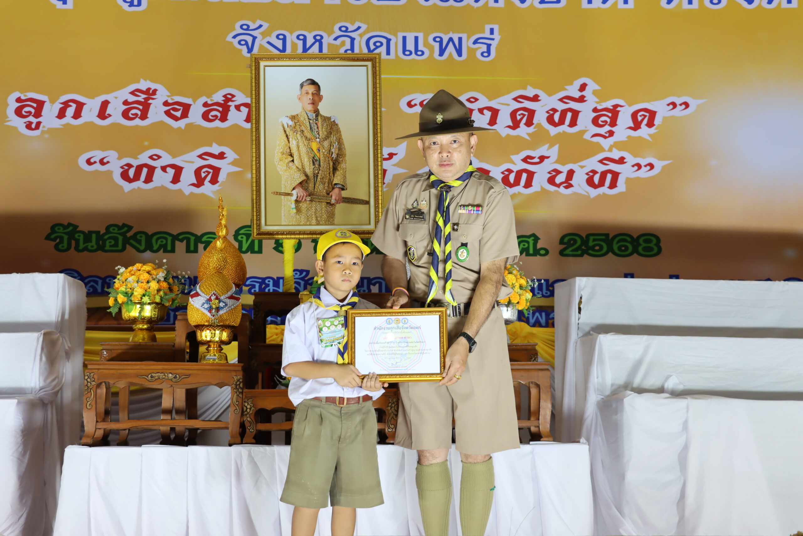 วันที่ 5 สิงหาคม 2568 เวลา 15.30 น. นายสมชัย เลิศประสิทธิพันธ์ ผู้ว่าราชการจังหวัดแพร่ ผู้อำนวยการลูกเสือจังหวัดแพร่ มอบหมายให้นายสุทิน จันทรวรเชตต์ ศึกษาธิการจังหวัดแพร่ เป็นประธานในพิธีปิดกิจกรรมงานชุมนุมลูกเสือสำรองแห่งชาติ ครั้งที่ 2 จังหวัดแพร่ ณ หอประชุมและแสดงศิลปวัฒนธรรมล้านนาตะวันออกและกลุ่มประเทศ GMS (กอเปา) ตำบลทุ่งโฮ้ง อำเภอเมืองแพร่ จังหวัดแพร่