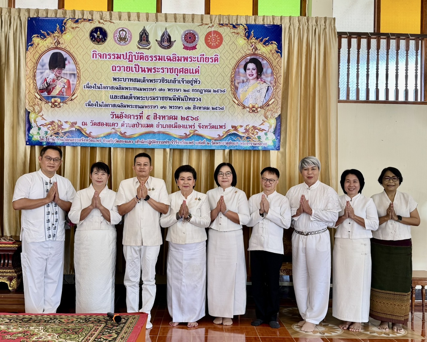 วันที่ 5 สิงหาคม 2568 นายสุทิน จันทรวรเชตต์ ศึกษาธิการจังหวัดแพร่ มอบหมายให้นางสาวพิชญา ดีมี ศึกษานิเทศก์ สำนักงานศึกษาธิการจังหวัดแพร่ พร้อมด้วย นางสาวจิรัชญา ส่วนมุ้ง และนางชุติกาญจน์ บัลลังค์นาค บุคลากรสำนักงานศึกษาธิการจังหวัดแพร่ ร่วมพิธีเปิดและร่วมกิจกรรมปฏิบัติธรรมเฉลิมพระเกียรติถวายเป็นพระราชกุศลแด่พระบาทสมเด็จพระวชิรเกล้าเจ้าอยู่หัว เนื่องในโอกาสเฉลิมพระชนมพรรษา 73 พรรษา 28 กรกฎาคม 2568 และสมเด็จพระบรมราชชนนีพันปีหลวง เนื่องในโอกาสเฉลิมพระชนมพรรษา 93 พรรษา 12 สิงหาคม 2568 โดยมีนายชัยสิทธิ์ ชัยสัมฤทธิ์ผล รองผู้ว่าราชการจังหวัดแพร่ เป็นประธานในพิธีฯ ณ สำนักปฏิบัติธรรมประจำจังหวัดแพร่ แห่งที่ 2 วัดพระธาตุช่อแฮ พระอารามหลวง สาขาวัดสองแคว ตำบลป่าแมต อำเภอเมืองแพร่ จังหวัดแพร่