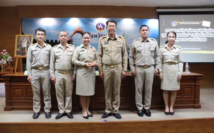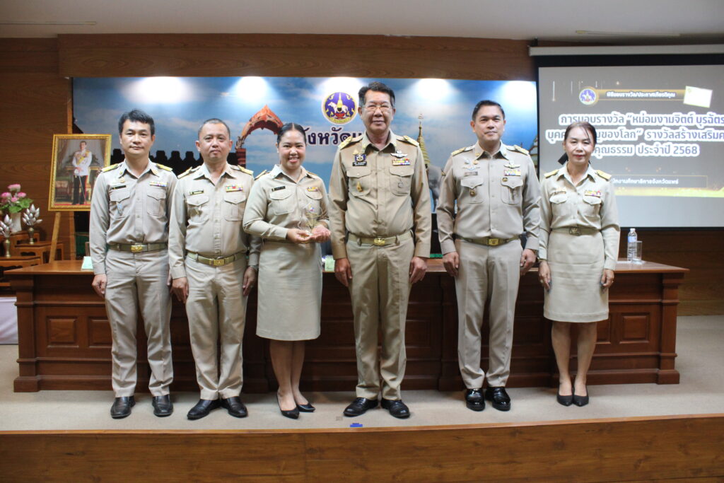 วันที่ 30 ตุลาคม 2568 เวลา 10.00 น. นายสมชัย เลิศประสิทธิพันธ์ ผู้ว่าราชการจังหวัดแพร่ มอบโล่เกียรติคุณและเข็มกลัดเชิดชูเกียรติ “หม่อมงามจิตต์ บุรฉัตร บุคคลสำคัญของโลก”รางวัลสร้างเสริมคนดีมีคุณธรรม ประจำปี 2568 จังหวัดแพร่ จำนวน 1 ราย คือ นางกรรณิการ์ ยาวิปา ครูวิทยาลัยการอาชีพลอง สังกัดสำนักงานอาชีวศึกษาจังหวัดแพร่ ในการประชุมคณะกรมการจังหวัดแพร่ฯ ครั้งที่ 10/2568 วันที่ 30 ตุลาคม 2568 ณ ห้องประชุมจดหมายเหตุ ศาลากลางจังหวัดแพร่ โดยมีนายคุณากร คชหิรัญ รองผู้ว่าราชการจังหวัดแพร่ สำนักงานศึกษาธิการจังหวัดแพร่ ผู้อำนวยการสำนักงานอาชีวศึกษาจังหวัดแพร่ ร่วมแสดงความยินดีในโอกาสนี้ด้วย