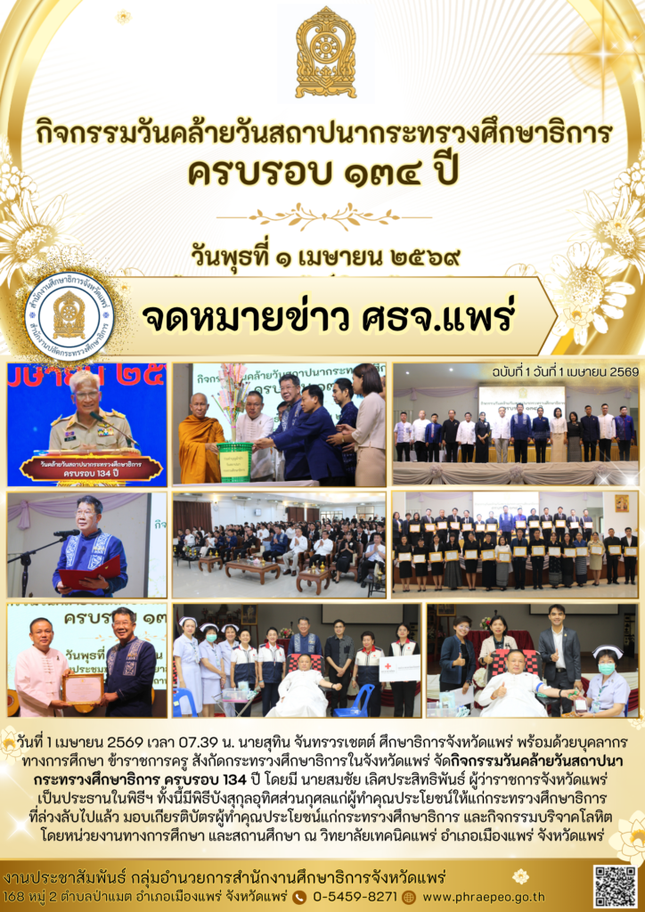 วันที่ 1 เมษายน 2569 เวลา 07.39 น. นายสุทิน จันทรวรเชตต์ ศึกษาธิการจังหวัดแพร่ พร้อมด้วยบุคลากรทางการศึกษา ข้าราชการครู สังกัดกระทรวงศึกษาธิการในจังหวัดแพร่ จัดกิจกรรมวันคล้ายวันสถาปนากระทรวงศึกษาธิการ ครบรอบ 134 ปี โดยมี นายสมชัย เลิศประสิทธิพันธ์ ผู้ว่าราชการจังหวัดแพร่
