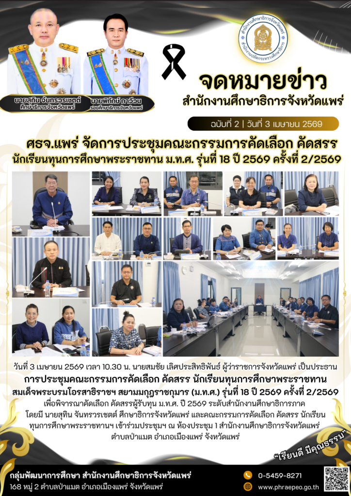เมษายน 10, 2569 No comments ข่าวประชาสัมพันธ์ ศธจ.แพร่ จัดการประชุมคณะกรรมการคัดเลือก คัดสรร นักเรียนทุนการศึกษาพระราชทาน ม.ท.ศ. รุ่นที่ 18 ปี 2569 ครั้งที่ 2/2569 Posted by คณิตกุล แดนเหมือง Share and Enjoy: Post Views: 18 FacebookFacebookXXLINELine