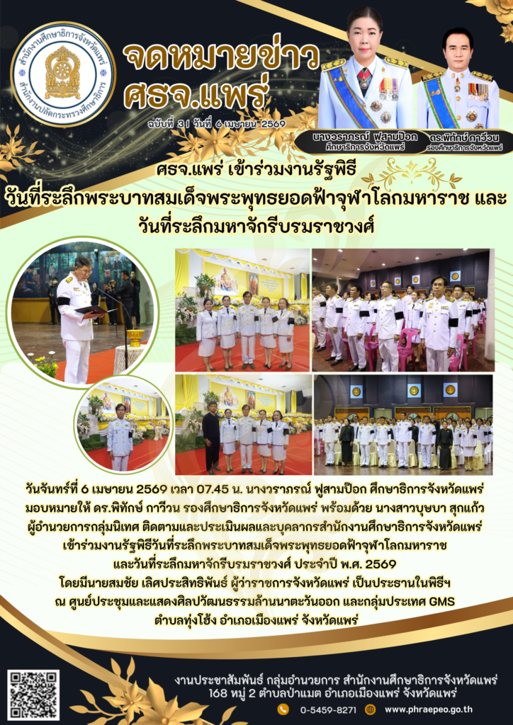 เมษายน 10, 2569 No comments ข่าวประชาสัมพันธ์ ศธจ.แพร่ เข้าร่วมงานรัฐพิธีวันที่ระลึกพระบาทสมเด็จพระพุธยอดฟ้าจุฬาโลกมหาราชและ วันระลึกมหาจักรีบรมราชวงศ์ Posted by คณิตกุล แดนเหมือง Share and Enjoy: Post Views: 14 FacebookFacebookXXLINELine