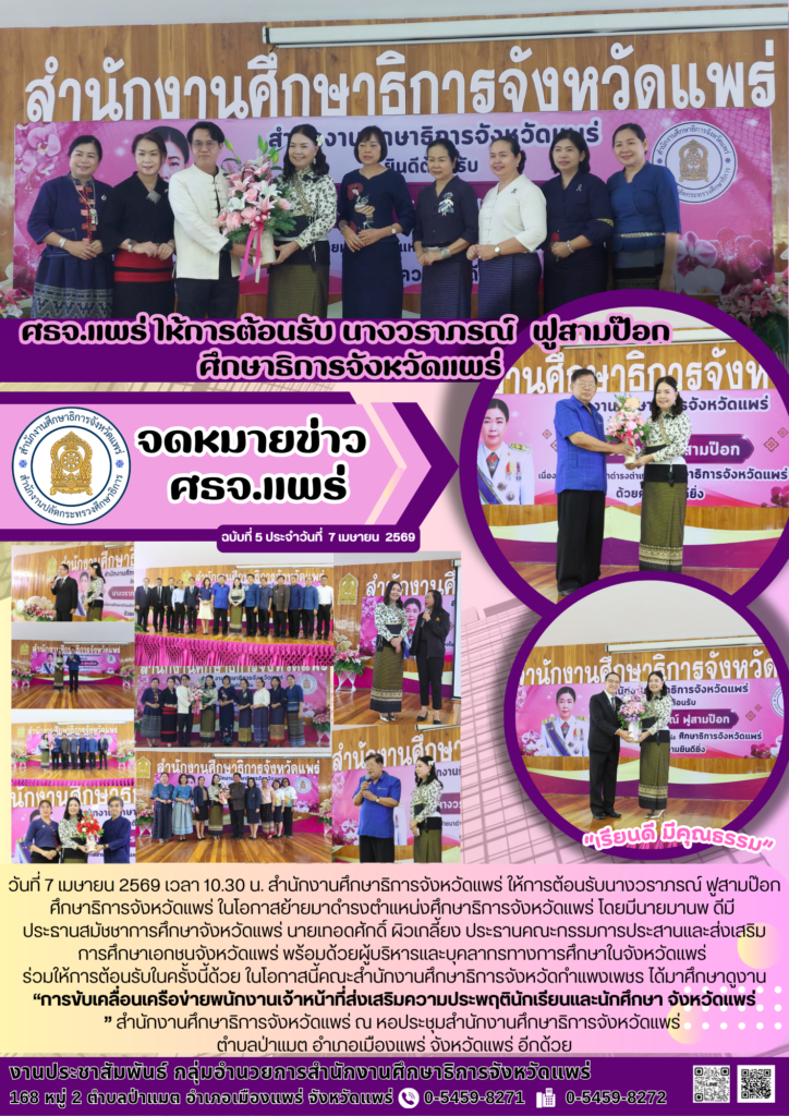 วันที่ 7 เมษายน 2569 เวลา 10.30 น. สำนักงานศึกษาธิการจังหวัดแพร่ ให้การต้อนรับนางวราภรณ์ ฟูสามป๊อก