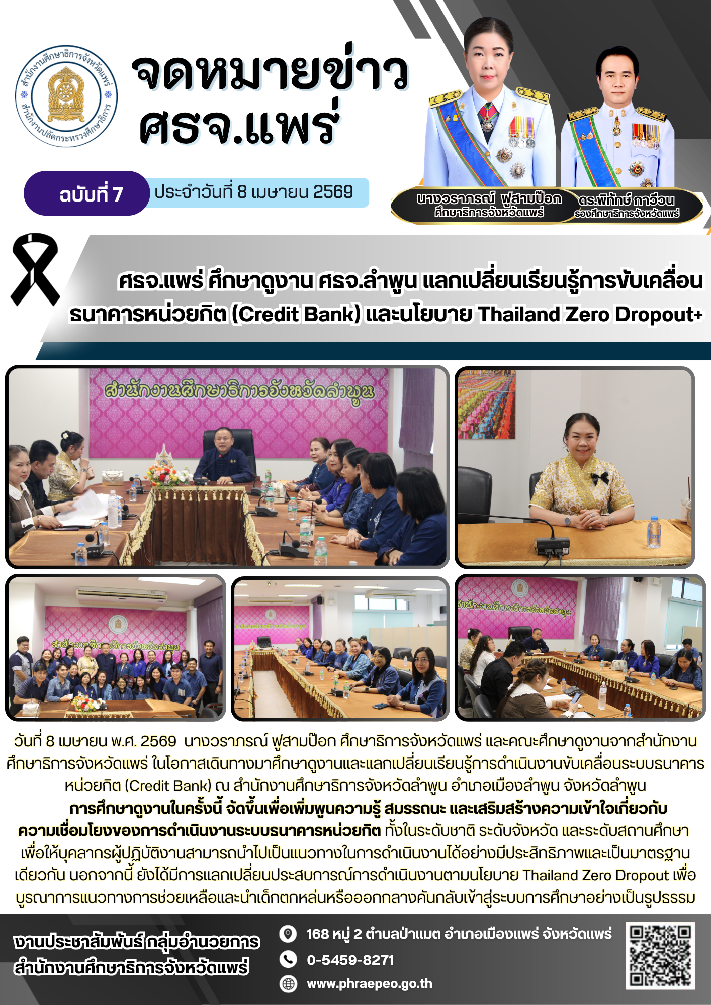 วันที่ 8 เมษายน พ.ศ. 2569 นางวราภรณ์ ฟูสามป๊อก ศึกษาธิการจังหวัดแพร่ และคณะศึกษาดูงานจากสำนักงานศึกษาธิการจังหวัดแพร่ ในโอกาสเดินทางมาศึกษาดูงานและแลกเปลี่ยนเรียนรู้การดำเนินงานขับเคลื่อนระบบธนาคารหน่วยกิต (Credit Bank) ณ สำนักงานศึกษาธิการจังหวัดลำพูน อำเภอเมืองลำพูน จังหวัดลำพูน