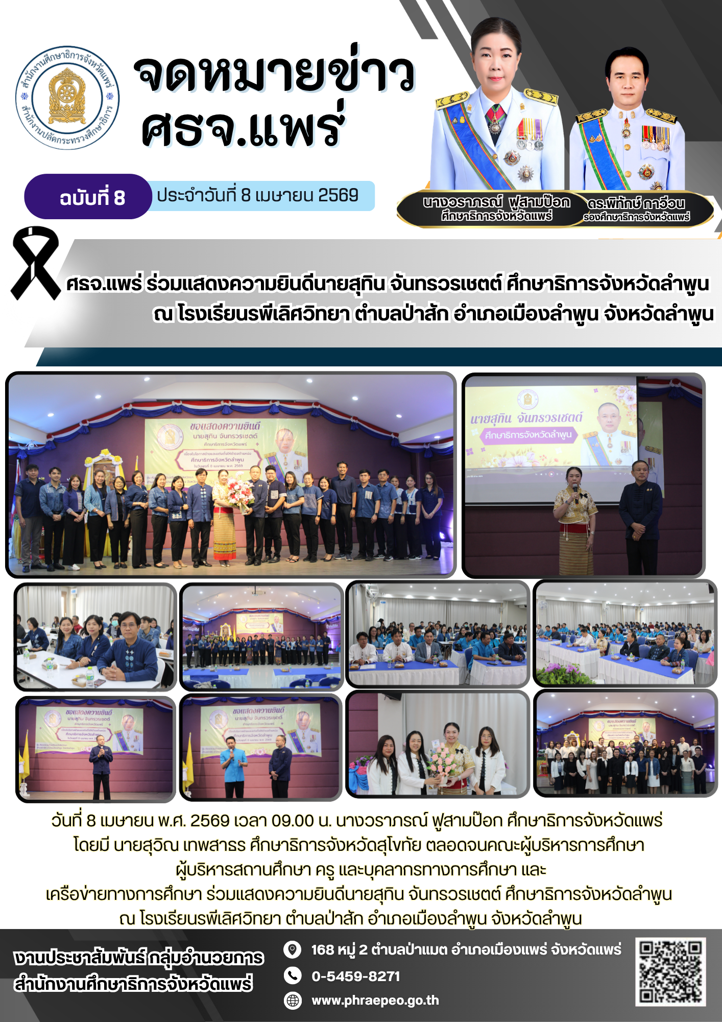 วันที่ 8 เมษายน พ.ศ. 2569 เวลา 09.00 น. นางวราภรณ์ ฟูสามป๊อก ศึกษาธิการจังหวัดแพร่
