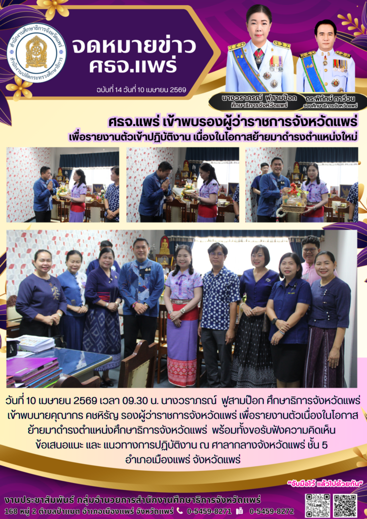 วันที่ 10 เมษายน 2569 เวลา 09.30 น. นางวราภรณ์ ฟูสามป๊อก ศึกษาธิการจังหวัดแพร่ เข้าพบนายคุณากร คชหิรัญ รองผู้ว่าราชการจังหวัดแพร่ เพื่อรายงานตัวเนื่องในโอกาสย้ายมาดำรงตำแหน่งศึกษาธิการจังหวัดแพร่ พร้อมทั้งขอรับฟังความคิดเห็น