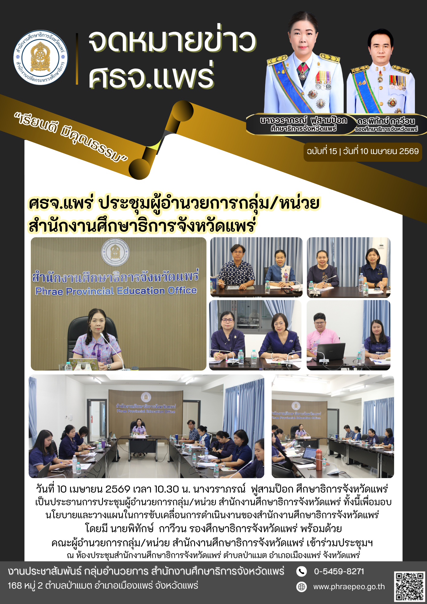 วันที่ 10 เมษายน 2569 เวลา 10.30 น. นางวราภรณ์ ฟูสามป๊อก ศึกษาธิการจังหวัดแพร่