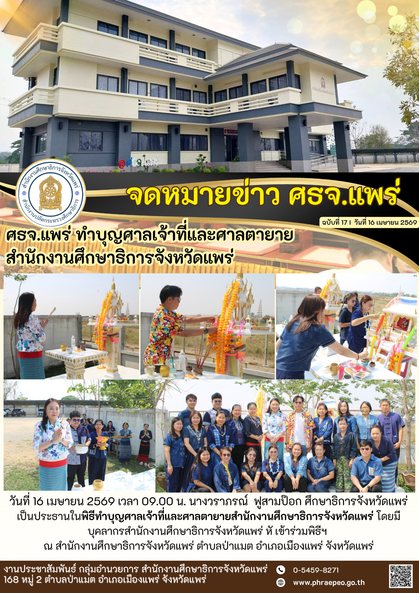 วันที่ 16 เมษายน 2569 เวลา 09.00 น. นางวราภรณ์ ฟูสามป๊อก ศึกษาธิการจังหวัดแพร่