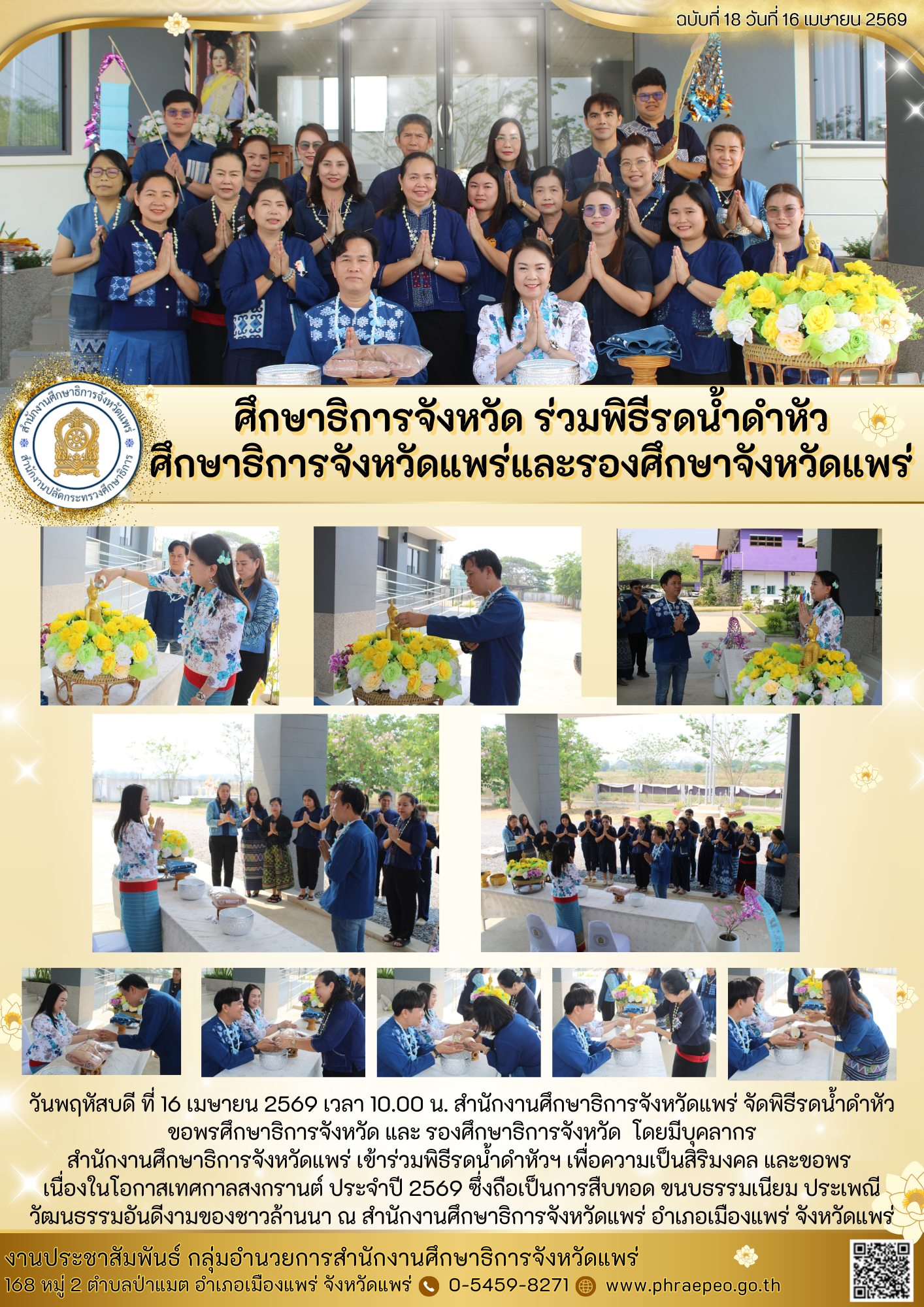 วันพฤหัสบดี ที่ 16 เมษายน 2569 เวลา 10.00 น. สำนักงานศึกษาธิการจังหวัดแพร่ จัดพิธีรดน้ำดำหัว