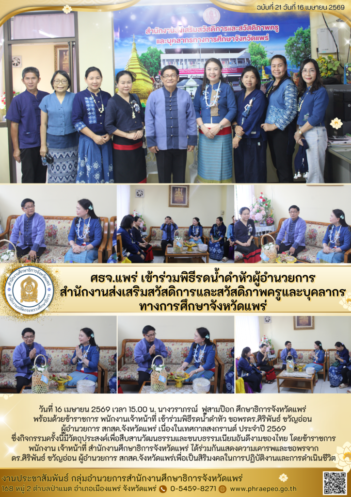 วันที่ 16 เมษายน 2569 เวลา 15.00 น. นางวราภรณ์ ฟูสามป๊อก ศึกษาธิการจังหวัดแพร่