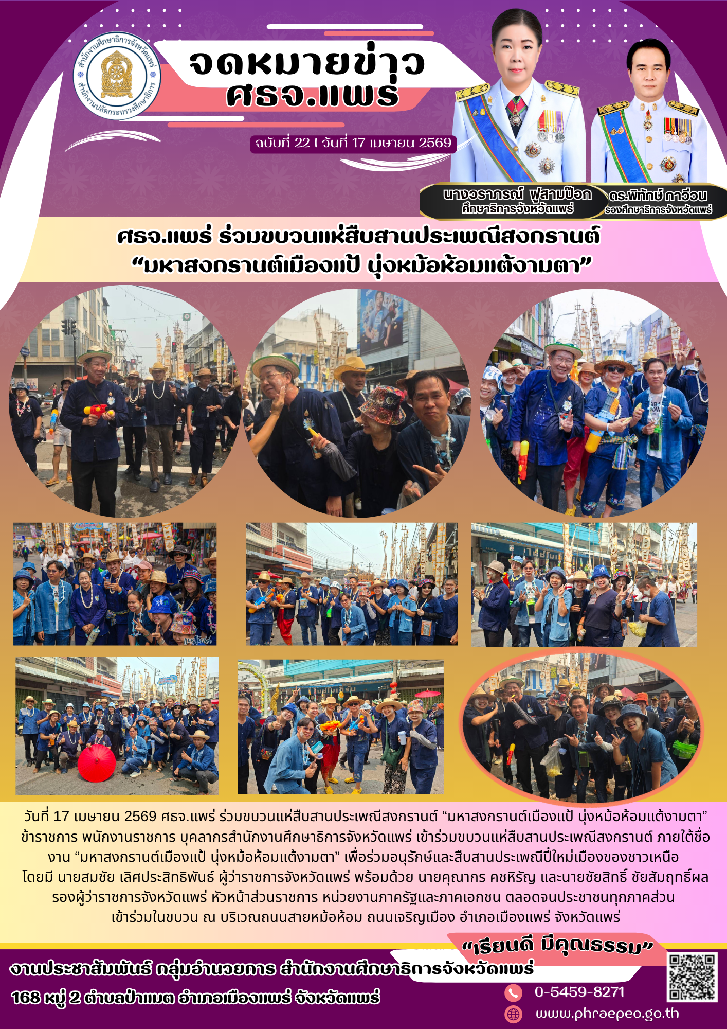 ข้าราชการ พนักงานราชการ บุคลากรสํานักงานศึกษาธิการจังหวัดแพร่ เข้าร่วมขบวนแห่สืบสานประเพณีสงกรานต์ ภายใต้ชื่องาน “มหาสงกรานต์เมืองแป้ นุ่งหม้อห้อมแต้งามตา” เพื่อร่วมอนุรักษ์และสืบสานประเพณีปี๋ใหม่เมืองของชาวเหนือ