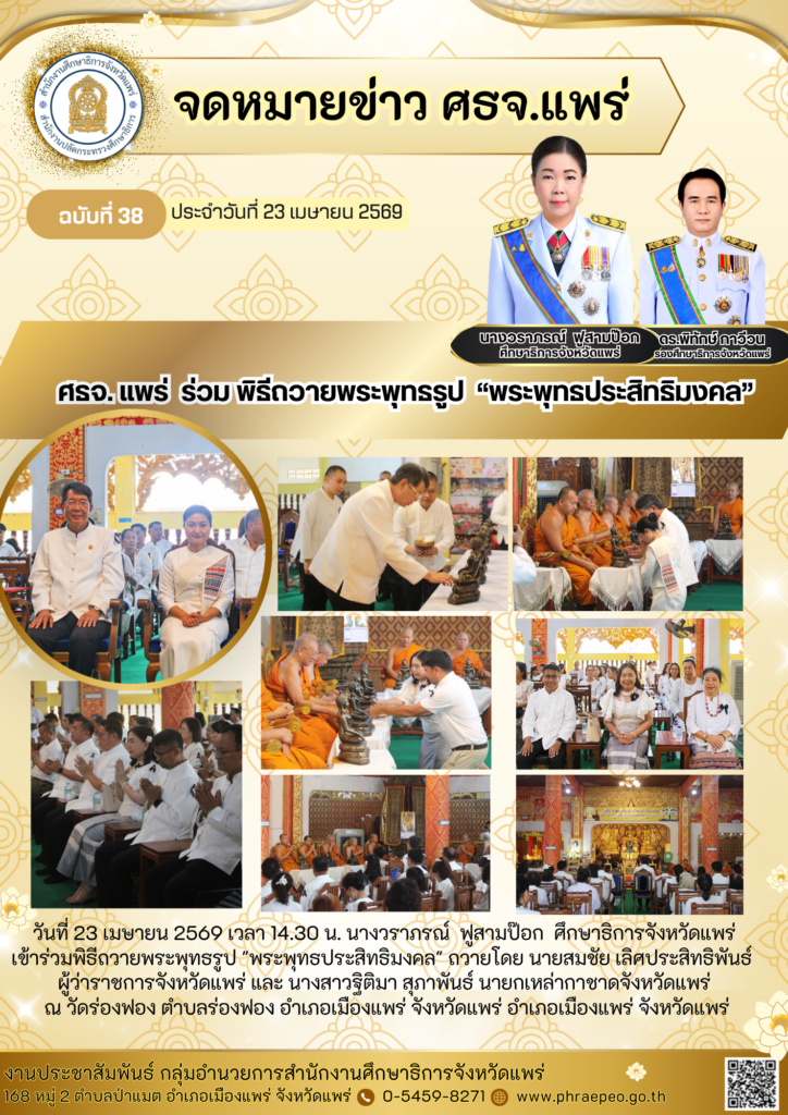 วันที่ 23 เมษายน 2569 เวลา 14.30 น. นางวราภรณ์ ฟูสามป๊อก ศึกษาธิการจังหวัดแพร่