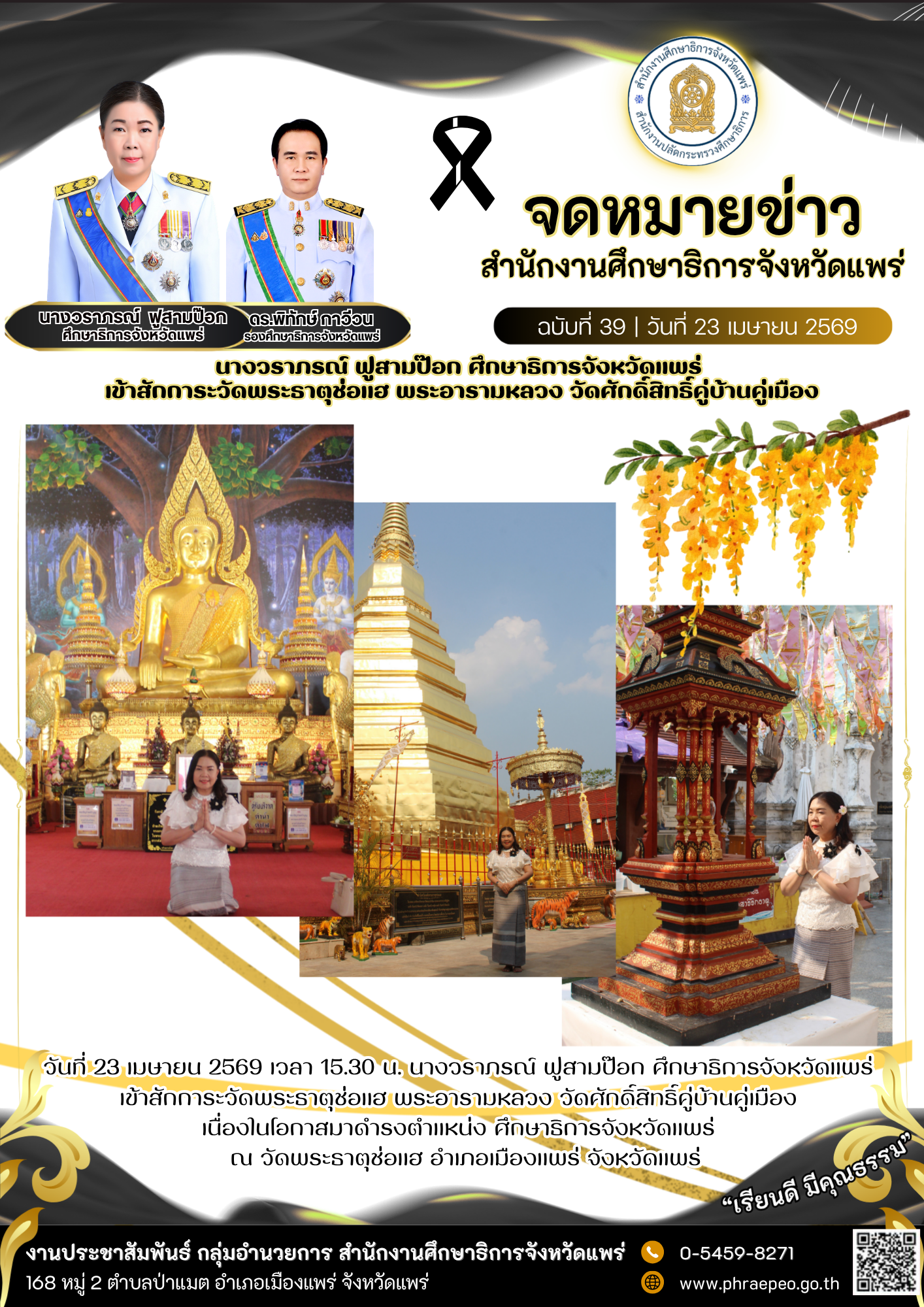 วันที่ 23 เมษายน 2569 เวลา 15.30 น. นางวราภรณ์ ฟูสามป๊อก ศึกษาธิการจังหวัดแพร่