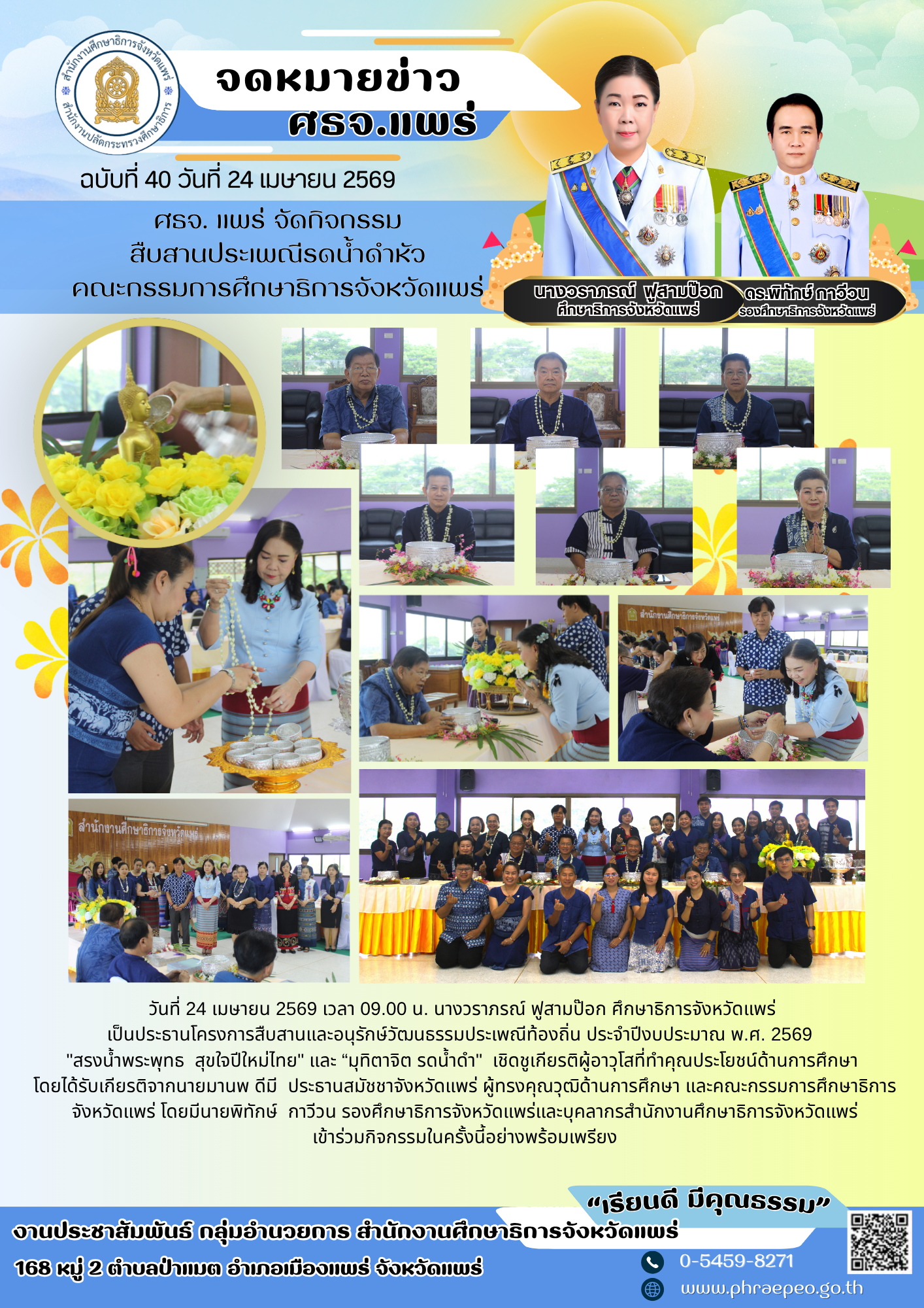 วันที่ 24 เมษายน 2569 เวลา 09.00 น. นางวราภรณ์ ฟูสามป๊อก ศึกษาธิการจังหวัดแพร่