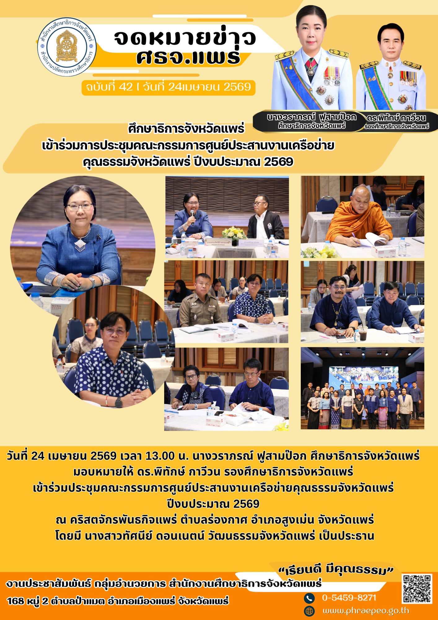วันที่ 24 เมษายน 2569 เวลา 13.00 น. นางวราภรณ์ ฟูสามป๊อก ศึกษาธิการจังหวัดแพร่