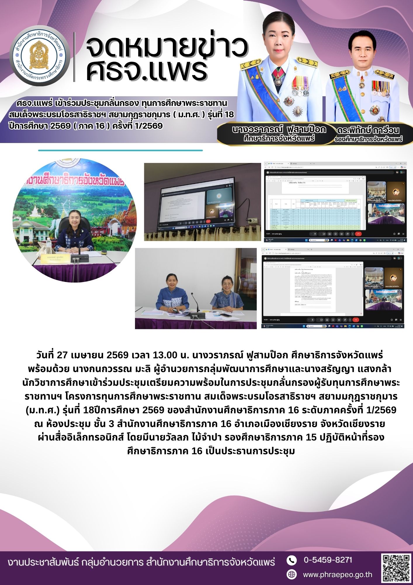 วันที่ 27 เมษายน 2569 เวลา 13.00 น. นางวราภรณ์ ฟูสามป๊อก ศึกษาธิการจังหวัดแพร่
