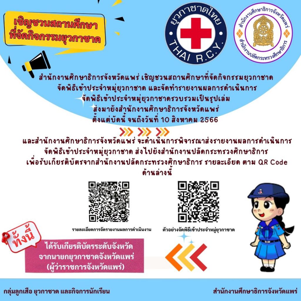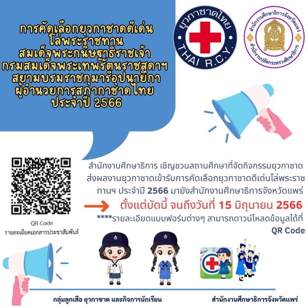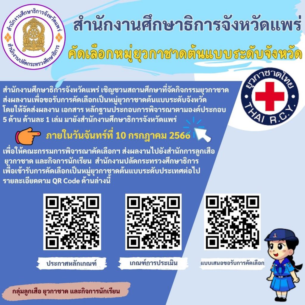 สำนักงานศึกษาธิการจังหวัดแพร่ คัดเลือกหมู่ยุวกาชาดต้นแบบระดับจังหวัด สำนักงานศึกษาธิการจังหวัดแพร่ เชิญชวนสถานศึกษาที่จัดกิจกรรมยุวกาชาดส่งผลงานเพื่อขอรับการคัดเลือกเป็นหมู่ยุวกาชาดต้นแบบระดับจังหวัดโดยให้จัดส่งผลงาน เอกสาร หลักฐานประกอบการพิจารณาตามองค์ประกอบ 5 ด้าน ด้านละ 1 เล่ม มายังสำนักงานศึกษาธิการจังหวัดแพร่ภายในวันจันทร์ที่ 10 กรกฎาคม 2566