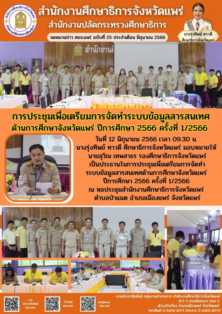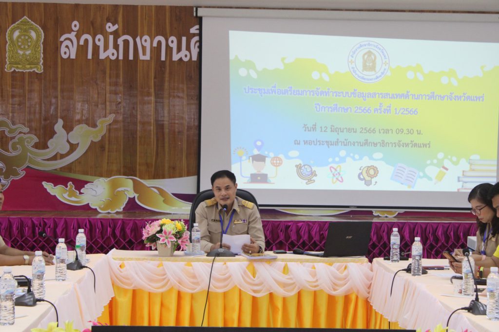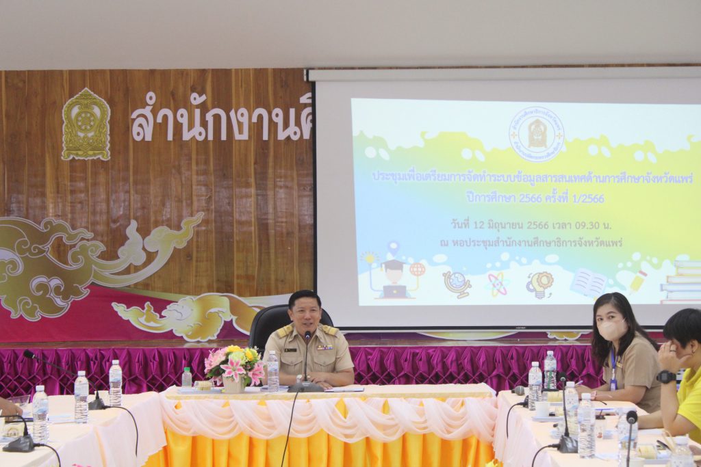 วันที่ 12 มิถุนายน 2566 เวลา 09.30 น. นางรุ่งทิพย์ ทาวดี ศึกษาธิการจังหวัดแพร่ มอบหมายให้ นายสุวิณ เทพสาธร รองศึกษาธิการจังหวัดแพร่เป็นประธานในการประชุมเพื่อเตรียมการจัดทำระบบข้อมูลสารสนเทศด้านการศึกษาจังหวัดแพร่ ปีการศึกษา 2566 ครั้งที่ 1/2566 ณ หอประชุมสำนักงานศึกษาธิการจังหวัดแพร่ ตำบลป่าแมต อำเภอเมืองแพร่ จังหวัดแพร่