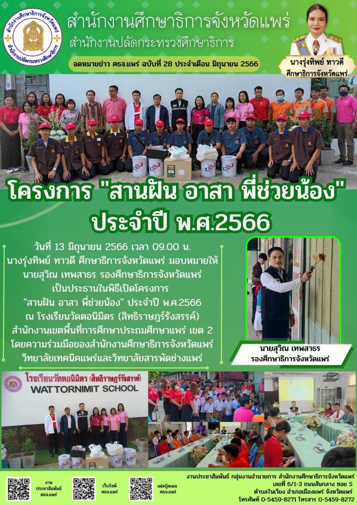 วันที่ 13 มิถุนายน 2566 เวลา 09.00 น. นางรุ่งทิพย์ ทาวดี ศึกษาธิการจังหวัดแพร่ มอบหมายให้ นายสุวิณ เทพสาธร รองศึกษาธิการจังหวัดแพร่เป็นประธานในพิธีเปิดโครงการ “สานฝัน อาสา พี่ช่วยน้อง” ประจำปี พ.ศ.2566 ณ โรงเรียนวัดตอนิมิตร (สิทธิราษฎร์รังสรรค์) สำนักงานเขตพื้นที่การศึกษาประถมศึกษาแพร่ เขต 2 โดยความร่วมมือ ของสำนักงานศึกษาธิการจังหวัดแพร่ วิทยาลัยเทคนิคแพร่และวิทยาลัยสารพัดช่างแพร่