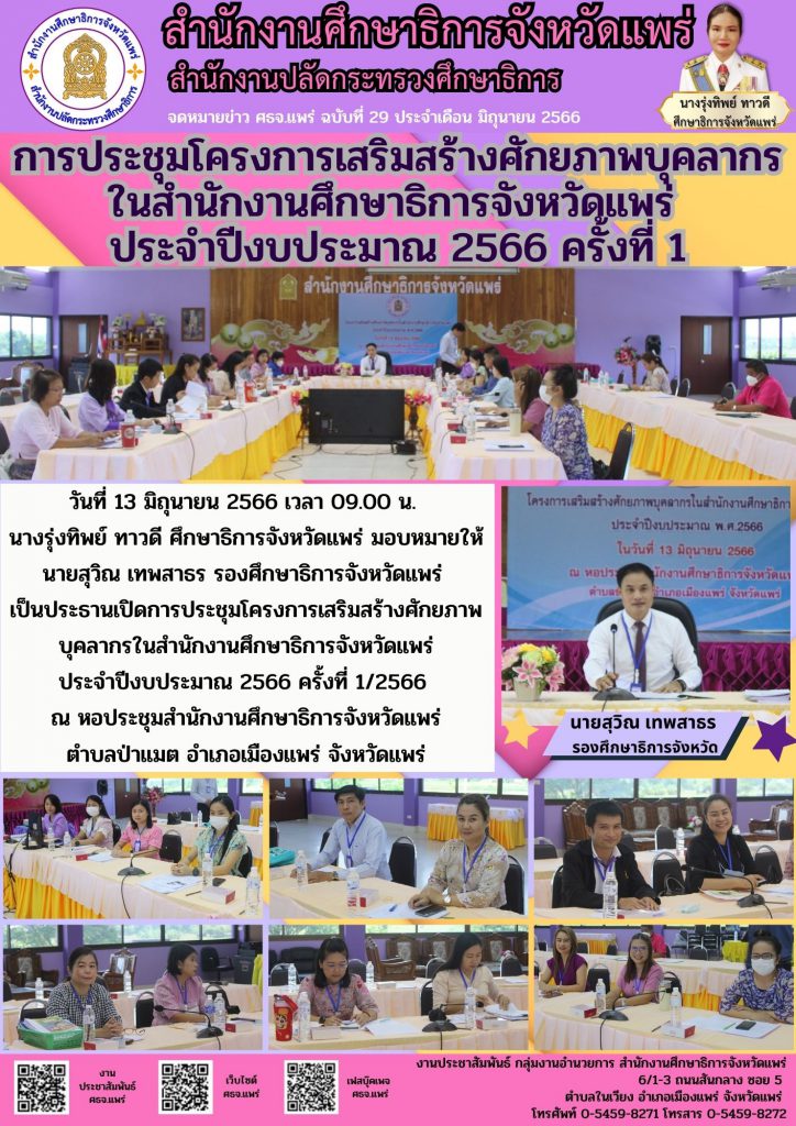 วันที่ 13 มิถุนายน 2566 เวลา 09.00 น. นางรุ่งทิพย์ ทาวดี ศึกษาธิการจังหวัดแพร่ มอบหมายให้นายสุวิณ เทพสาธร รองศึกษาธิการจังหวัดแพร่ เป็นประธานเปิดการประชุมโครงการเสริมสร้างศักยภาพบุคลากรในสำนักงานศึกษาธิการจังหวัดแพร่ ประจำปีงบประมาณ 2566 ครั้งที่ 1/2566 ณ หอประชุมสำนักงานศึกษาธิการจังหวัดแพร่ ตำบลป่าแมต อำเภอเมืองแพร่ จังหวัดแพร่